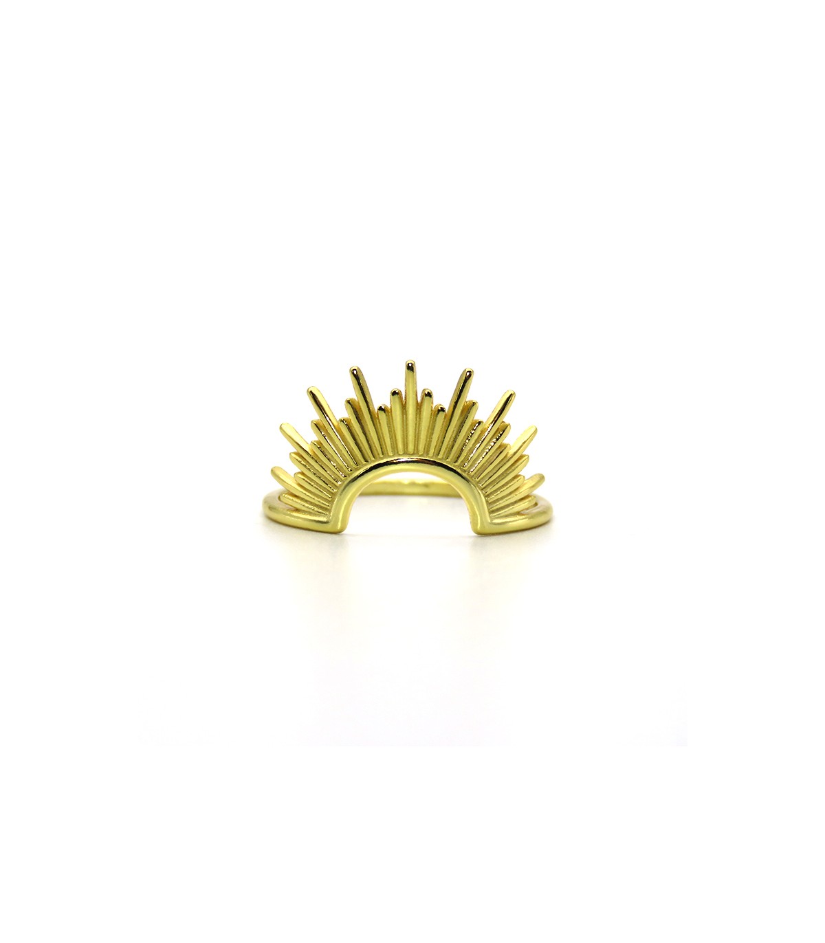 L'anell Raigs de Sol es compon per una anell fi i espectacular al mateix temps que representa el sol sobre l'horitzó. Mesura del cèrcol és d'1 mm de gruix. El sol mesura 18mm d'ample i 12 mm d'alt. Queda perfecte tant només com combinat amb altres anells amb minerals i midis. Ideal per a totes les ocasions.