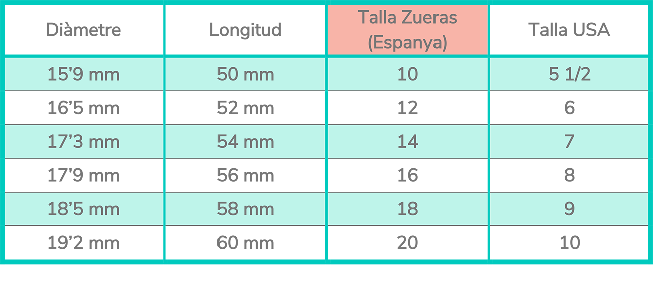 1. Agafa un anell que et vagi bé i mesura el diàmetre per l'interior de l'anell (descartant el gruix de l'anell), com es mostra en la següent figura. Aquesta mesura en mil·límetres serà el diàmetre. Comprova la talla amb la següent taula.