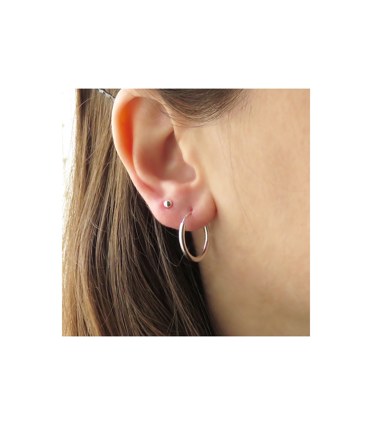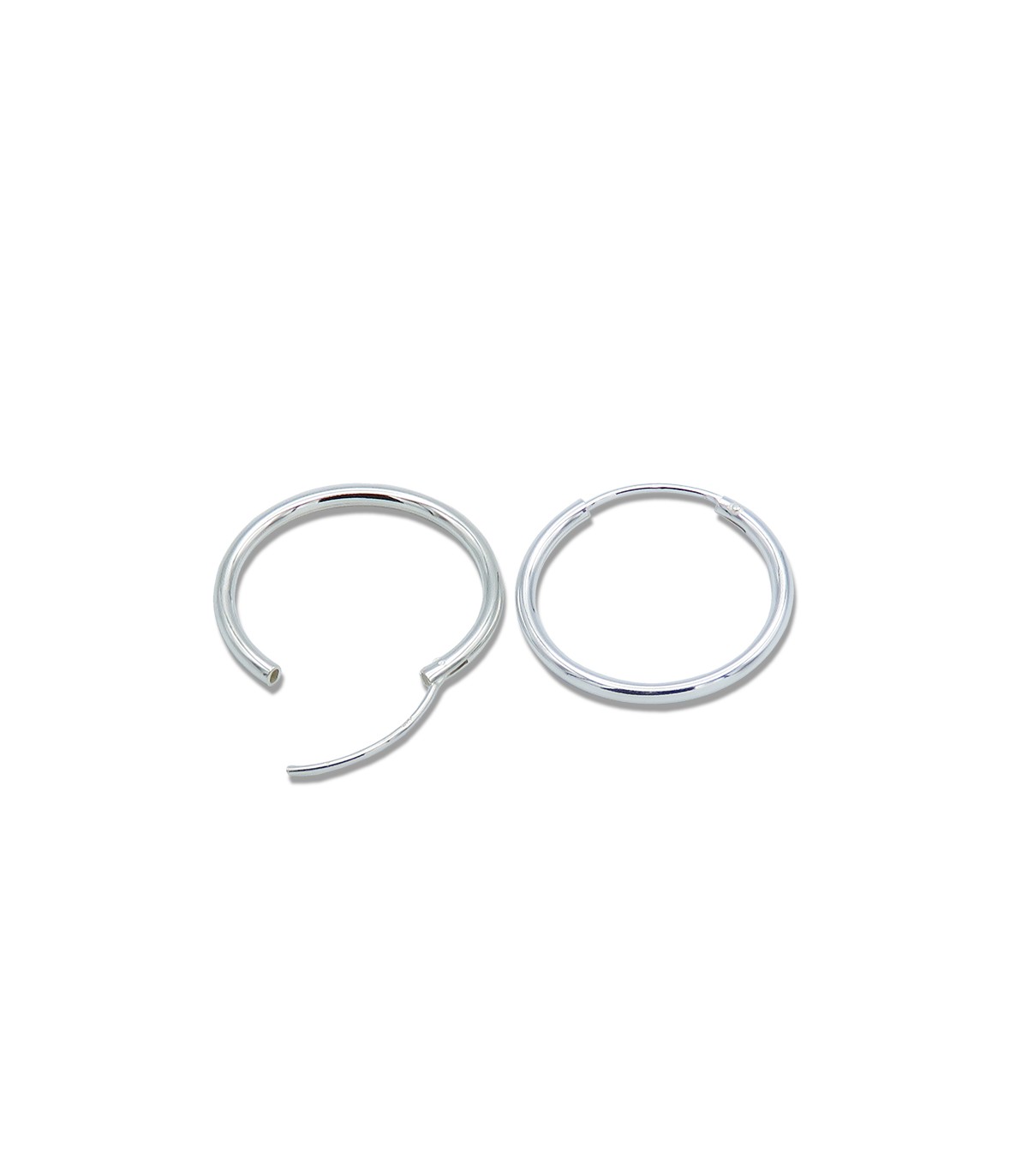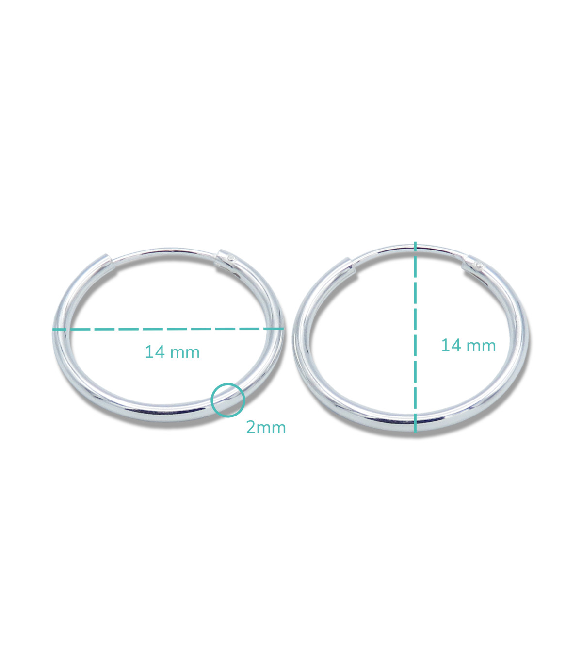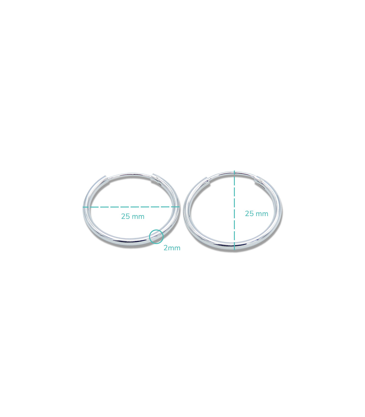 Arracades tipus aro de plata llisa amb tancament invisible. Els aros són de 2 mm de gruix que ho fan resistents i de diferents mides de diàmetre: 14, 16, 18, 20, 25, 30, 40, i 60 mil·límetres de diàmetre.