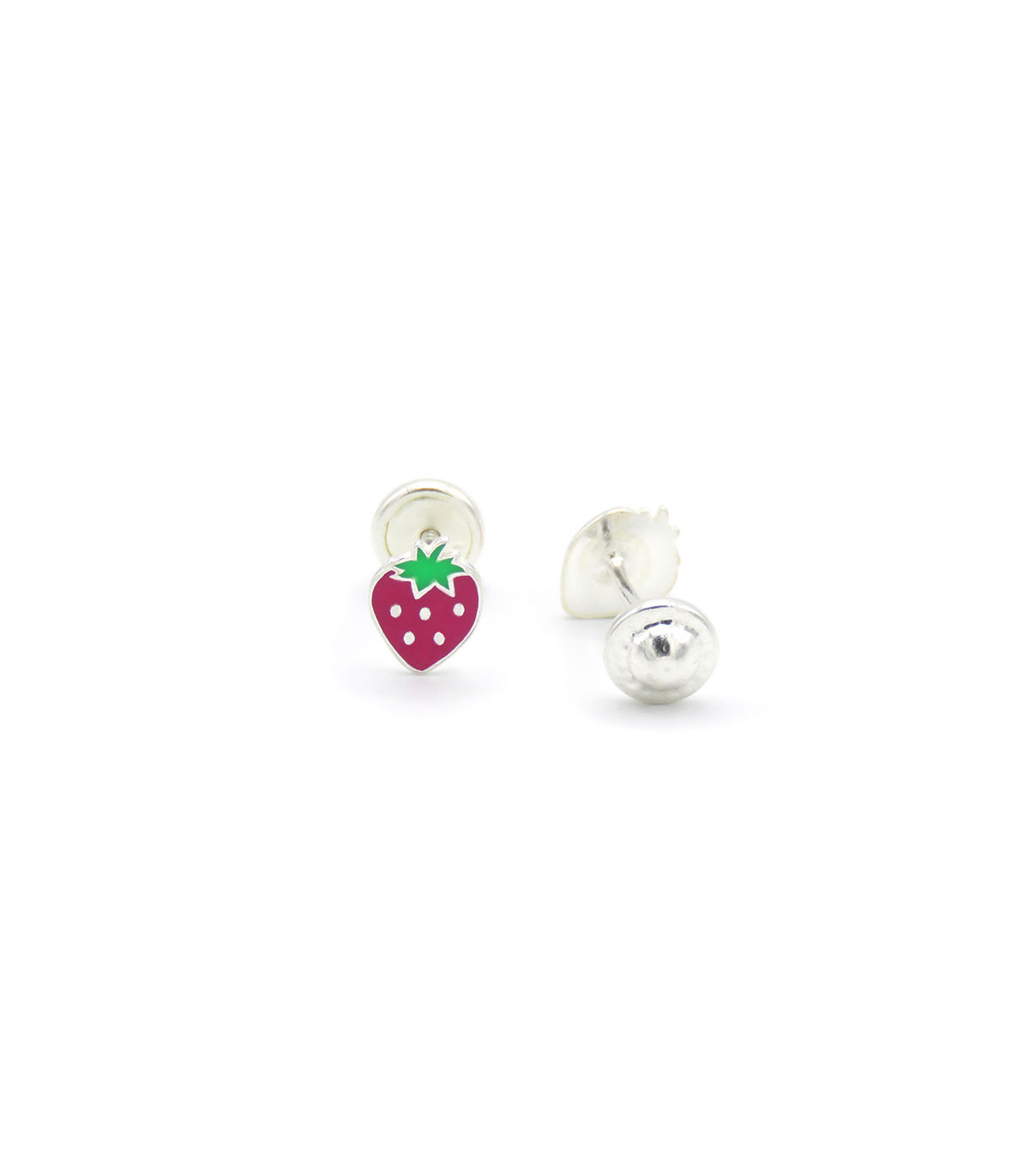 Arracades de boniques maduixes de plata de llei 925, esmalt verd i rosa fucsia. La mesura és 5 mm d'ample per 7 mm d'alt. El tancament és de rosca, ideal per a la infància. Es venen per parelles.