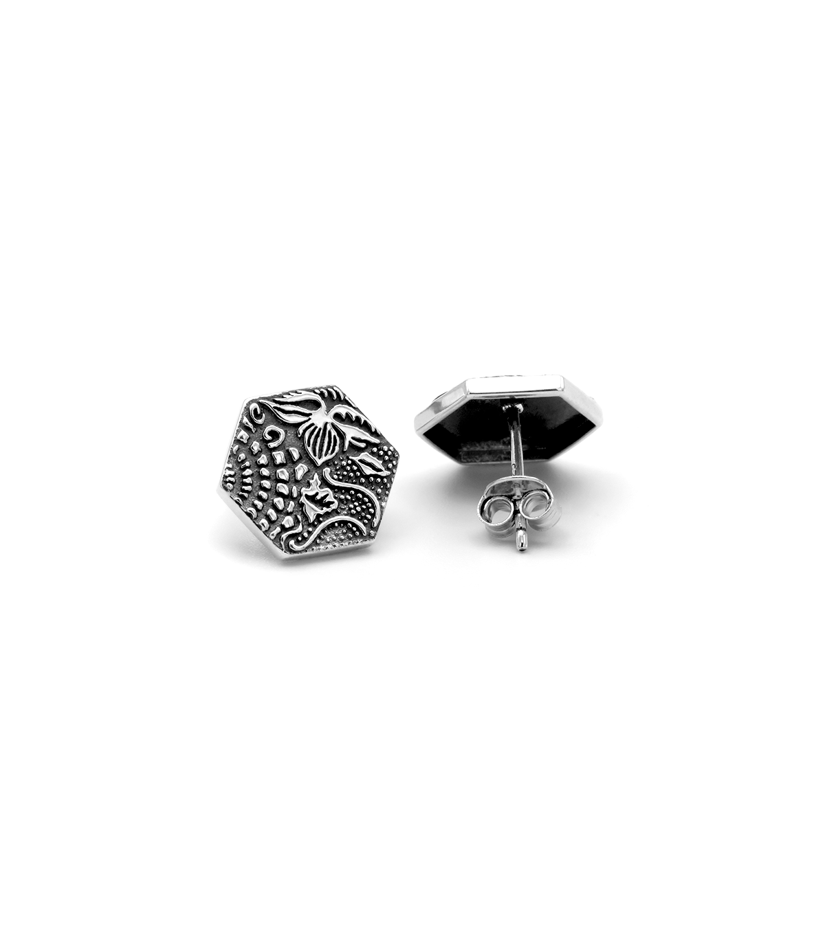 L'arracada mesura 15 mm de vèrtex a vèrtex i està realitzada en plata 925 polida (relleu de les figures) i amb el fons de plata oxidada de manera que queden ben ressaltats els detalls marins.