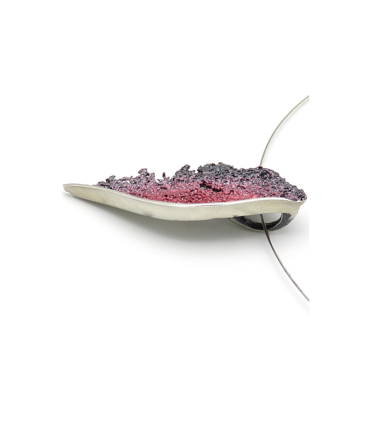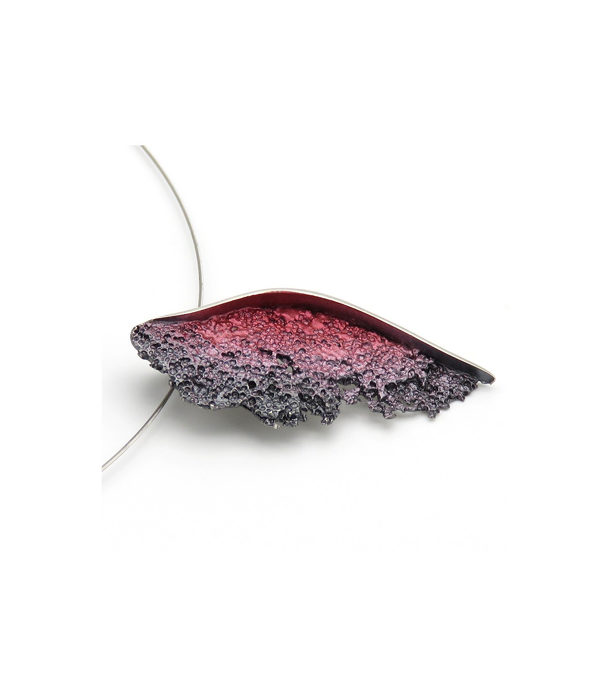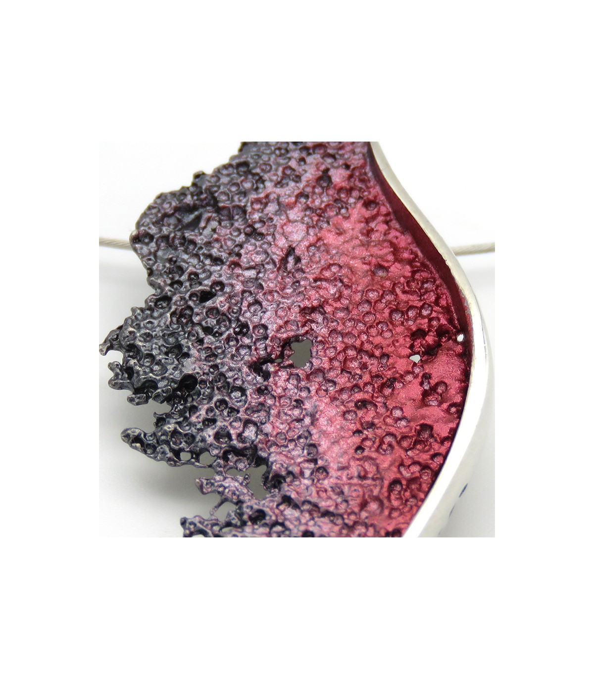 La peça està disponible en color bordeus en plata de llei 925 amb cordó d'acer inoxidable, per la qual cosa no es deforma, i tancament de seguretat de plata.