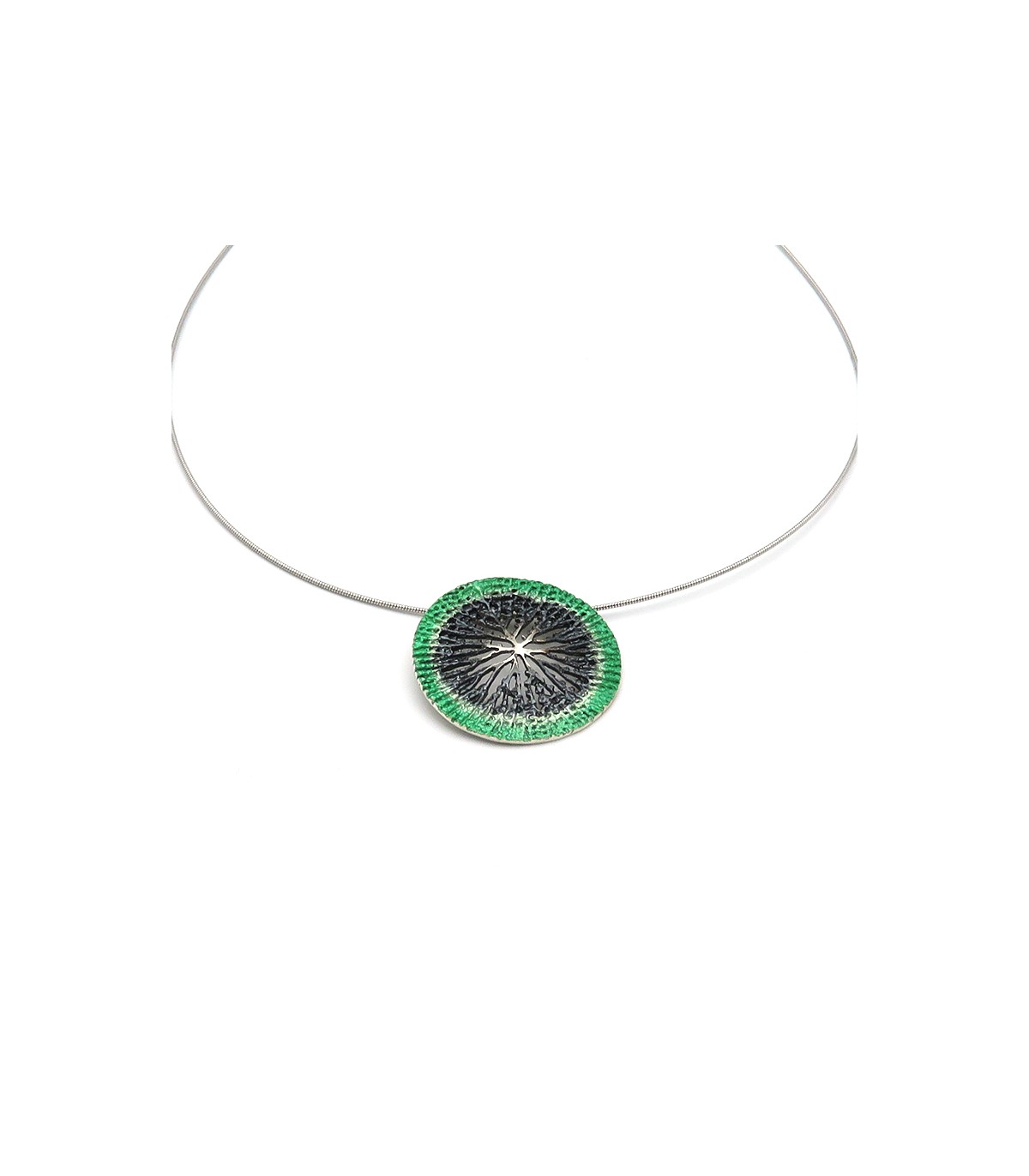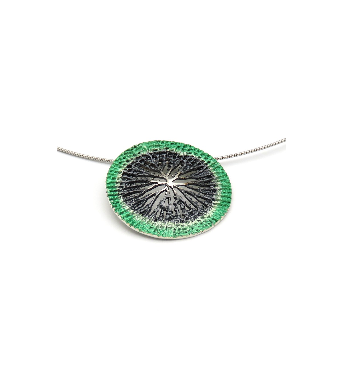 Collaret amb penjoll rodó i calat inspirat en la flor del nenúfar. Color verd. Cadena inclosa.