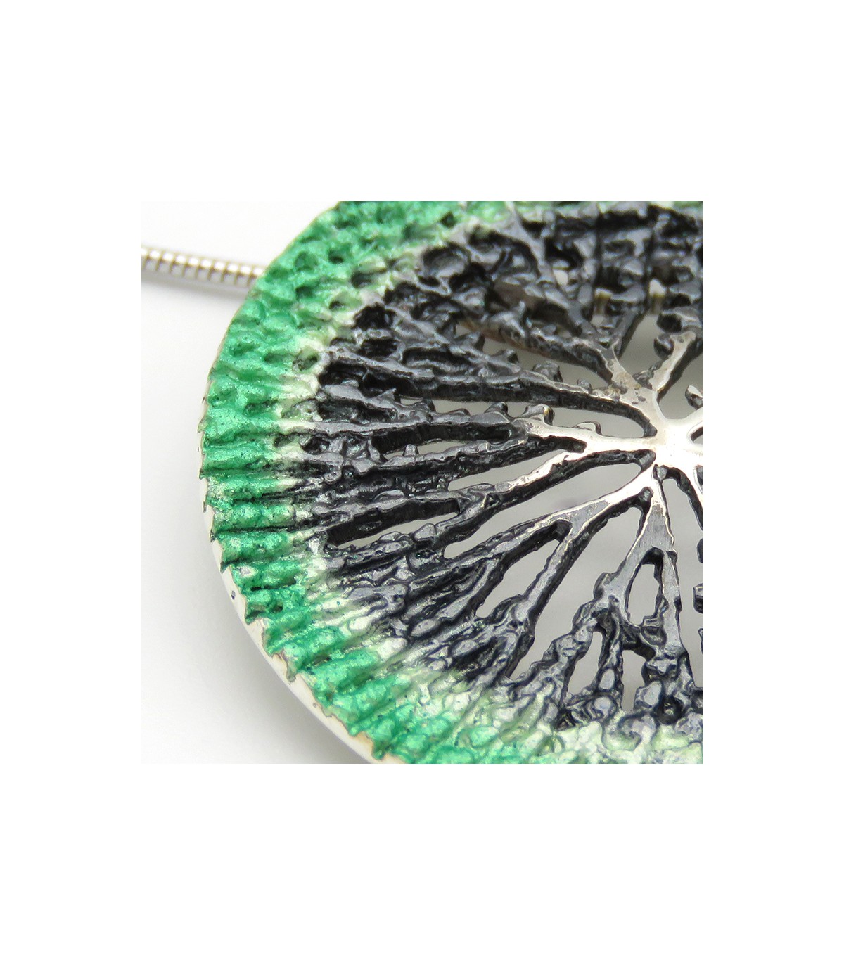 El penjoll Nenúfar és un penjoll de plata 925 creat de manera artesanal per ORFEGA, joieria d'autor de Santiago de Compostel·la, Galícia. Aquesta col·lecció està inspirada a l'interior de la flor del nenúfar, com el seu nom indica. En aquesta ocasió oferim el penjoll Nenúfar de color verd realitzat amb la tècnica SIMELTECH®. Es tracta d'un penjoll rodó de 30 mm de diàmetre amb el contorn de pigment verd degradat i plata oxidada (negre).
