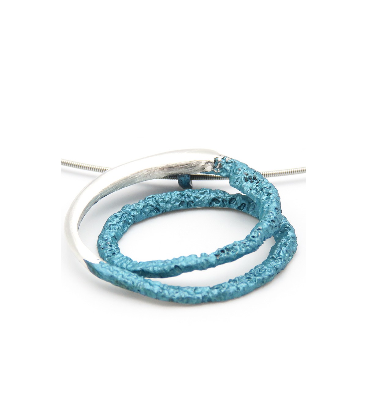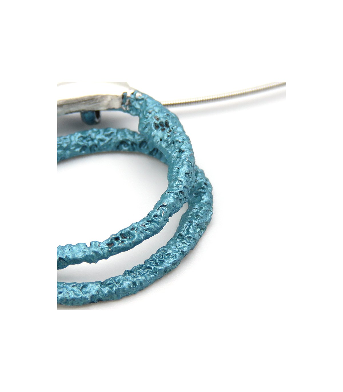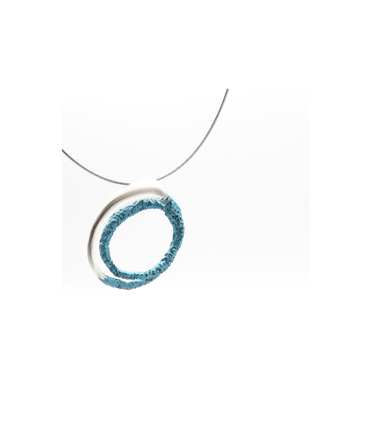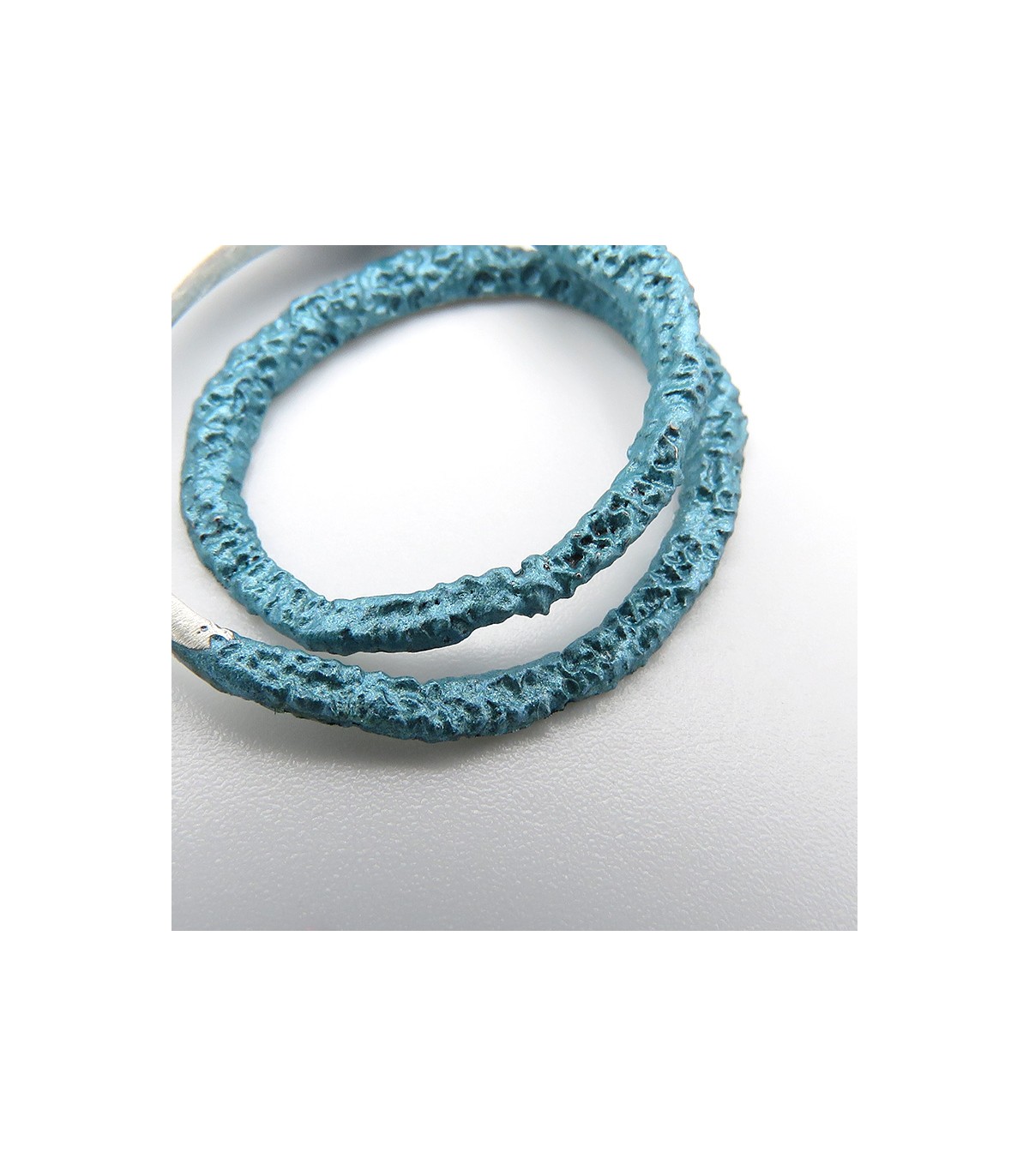 La peça està disponible en color blau turquesa metal·litzat en plata de llei 925 amb cordó d'acer inoxidable tipus moll de 0'8 mm, per la qual cosa no es deforma, i tancament de seguretat de plata.