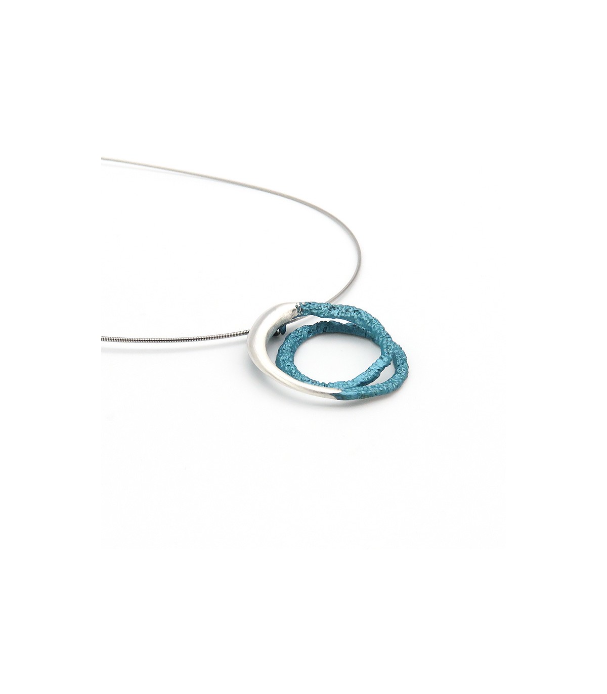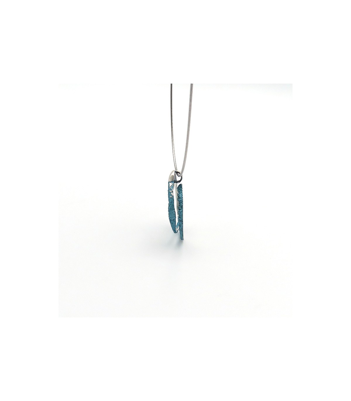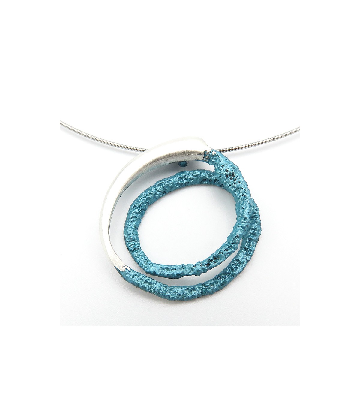 La peça està disponible en color blau turquesa metal·litzat en plata de llei 925 amb cordó d'acer inoxidable tipus moll de 0'8 mm, per la qual cosa no es deforma, i tancament de seguretat de plata.