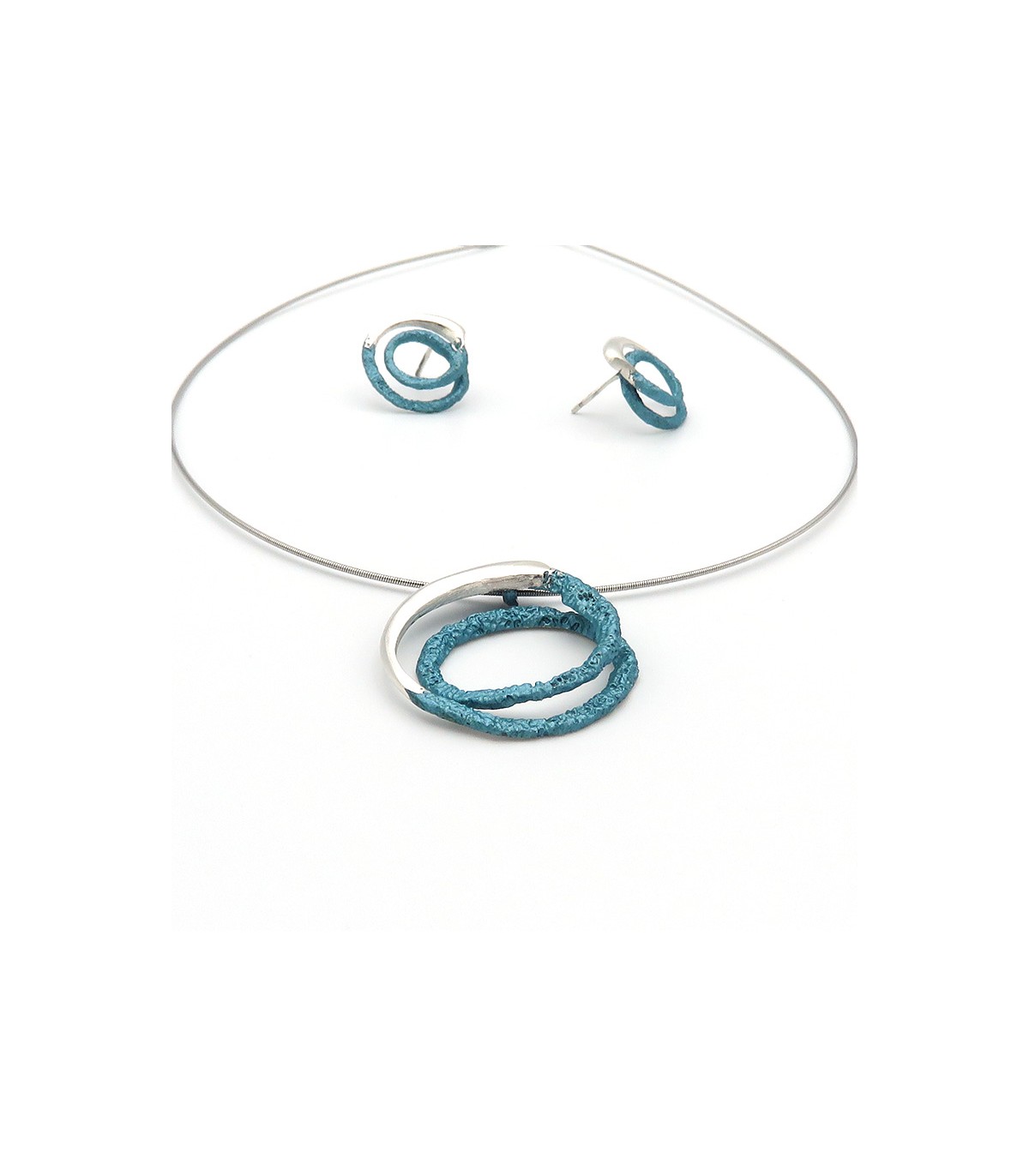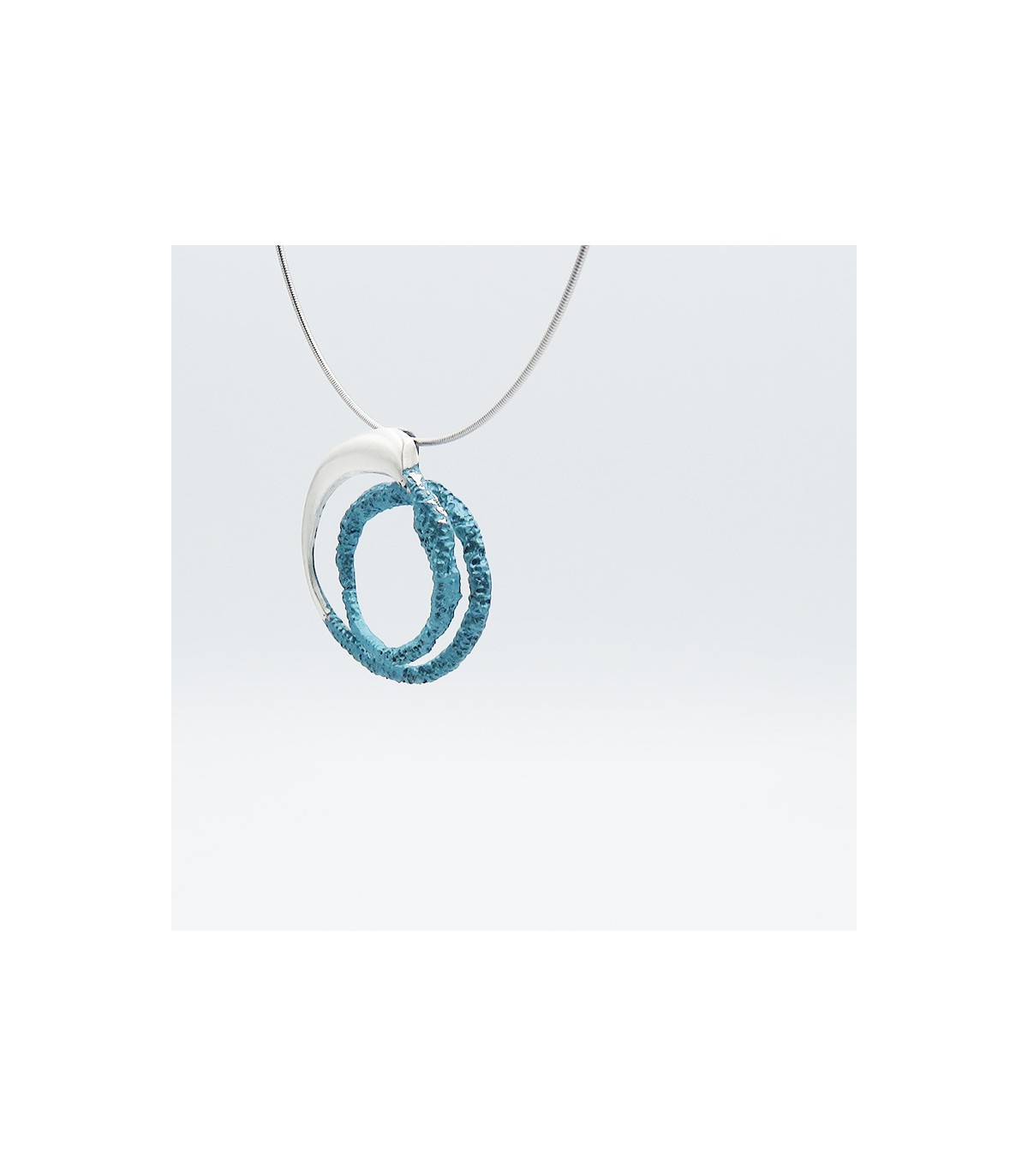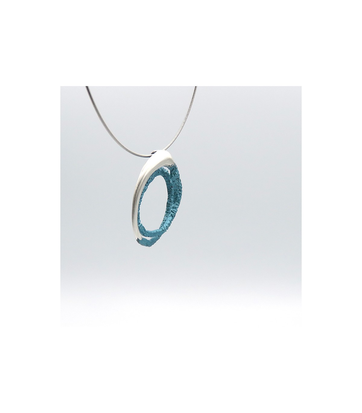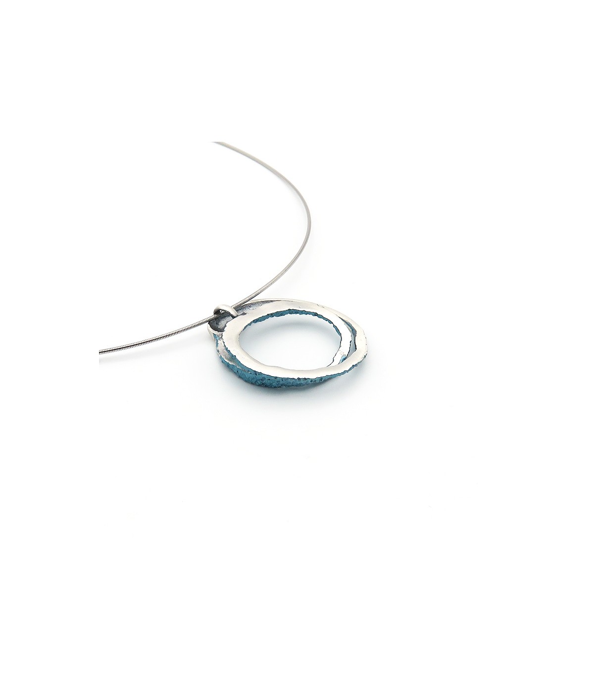 La peça està disponible en color blau turquesa metal·litzat en plata de llei 925 amb cordó d'acer inoxidable tipus moll de 0'8 mm, per la qual cosa no es deforma, i tancament de seguretat de plata.