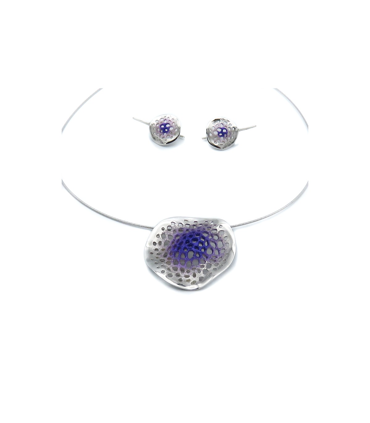 Collaret amb penjoll rodó i calat. Color violeta. Cadena inclosa.