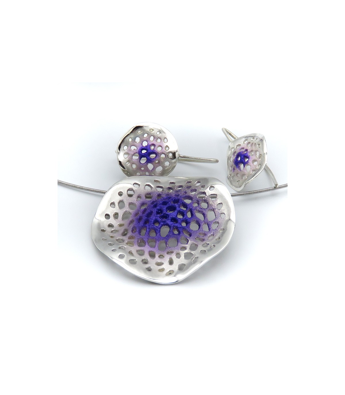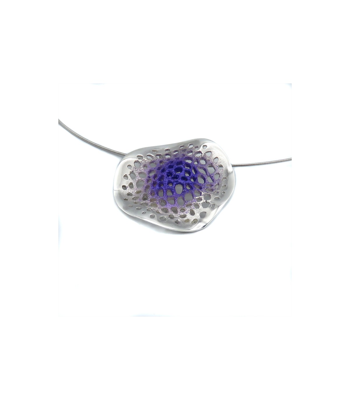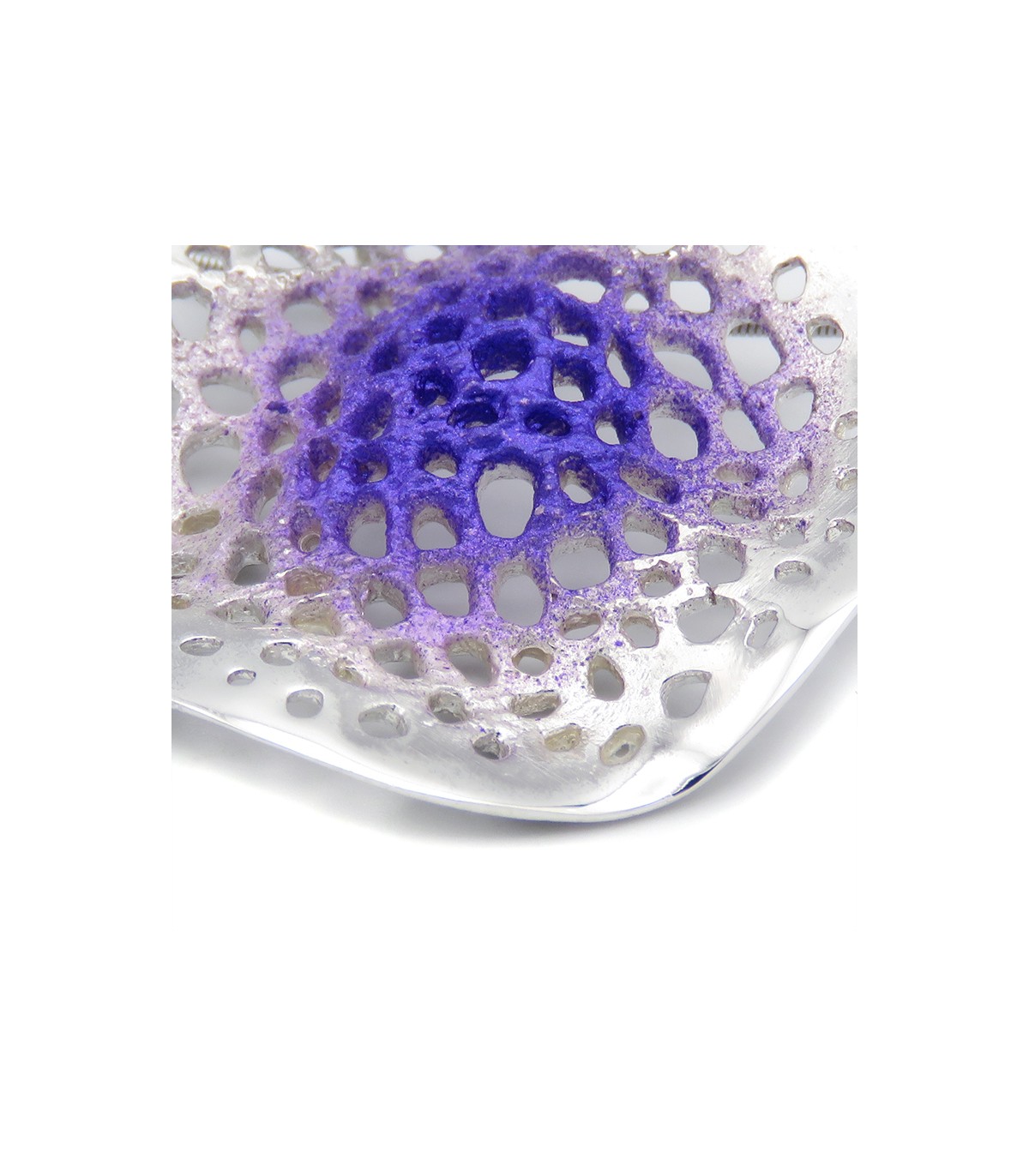 El penjoll Micro és un penjoll de plata 925 creat de manera artesanal per ORFEGA, joieria d'autor de Santiago de Compostel·la, Galícia. Aquesta col·lecció està inspirada en allò que no es veu de la naturalesa, però està. En aquesta ocasió oferim el penjant Micro de color violeta realitzat amb la tècnica SIMELTECH®. Es tracta d'un penjoll rodó perforat de 33 mm de diàmetre.