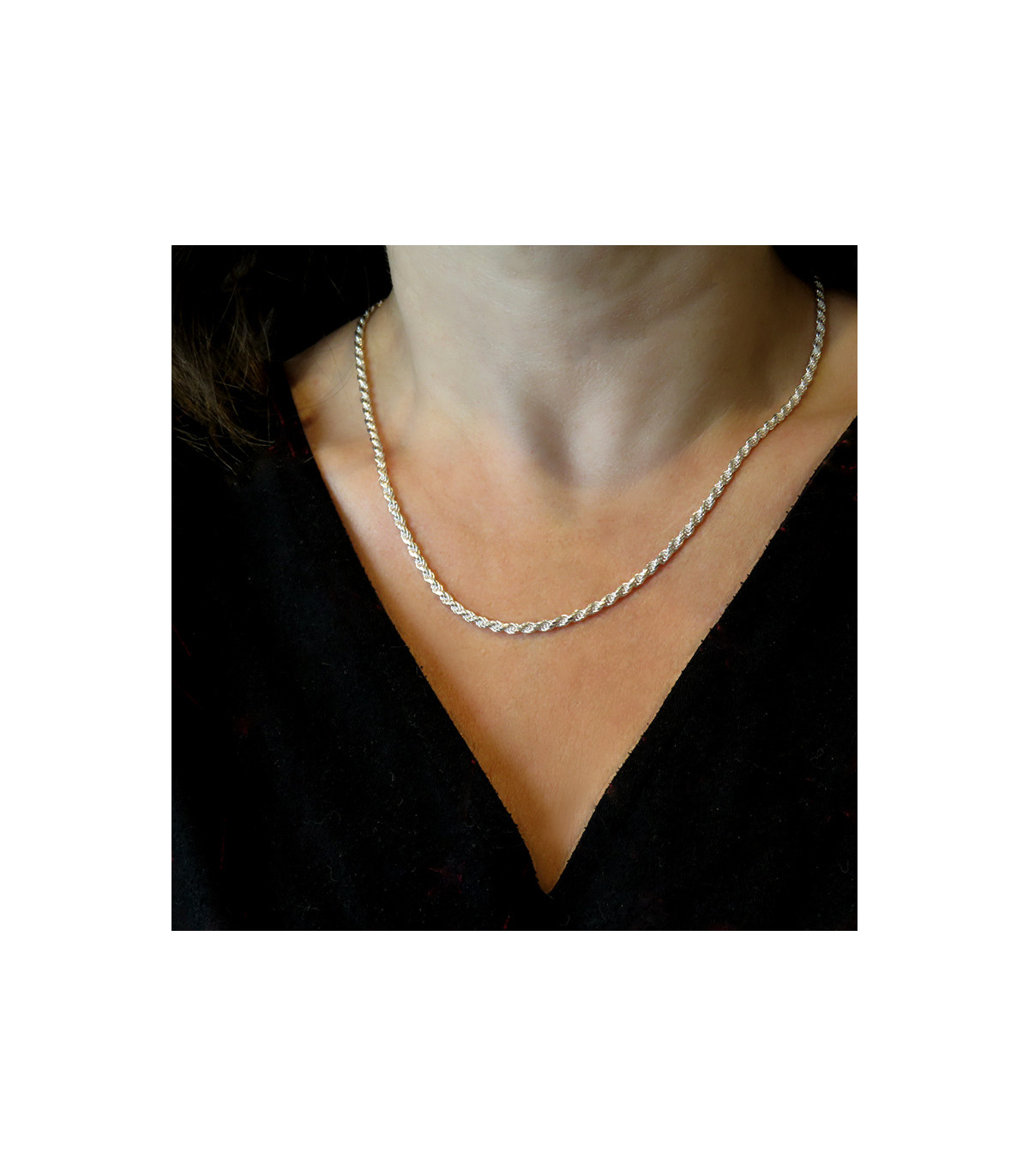 Collaret de plata 925 fet amb una cadena trenada del tipus cordó salomònic amb acabat polit ideal per a tota mena de persona de diferents edats i estils i és totalment atemporal. Està disponible en diferents longituds i gruixos. Té un tancament gruixut i segur de mosquetó adequat al gruix de la cadena. Es pot emportar sola com a collaret o amb un penjoll.