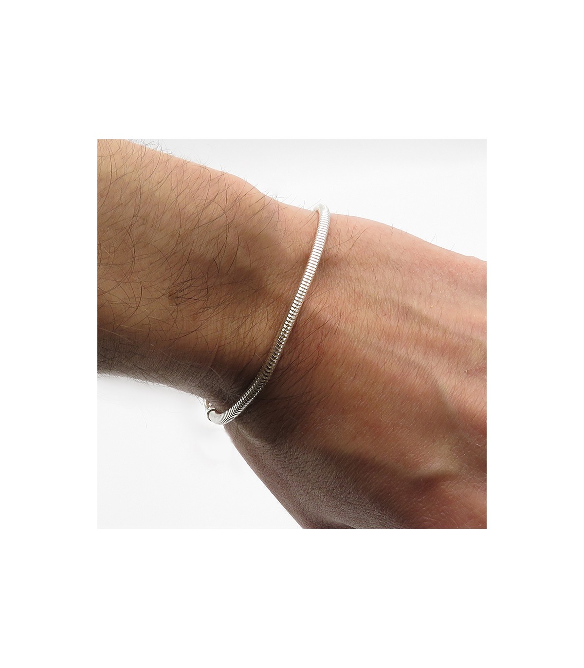 Polsera de plata 925 feta amb una cadena de tipus Snake rodona (o també coneguda per cua de ratolí) de 3 mm d'ample. Tenim dues mesures: 18 cm i 19 cm de llarg. Té un tancament gruixut i segur de mosquetó adequat al gruix de la cadena. Es tracta d'una polsera que agrada a tota mena de persones de totes les edats.