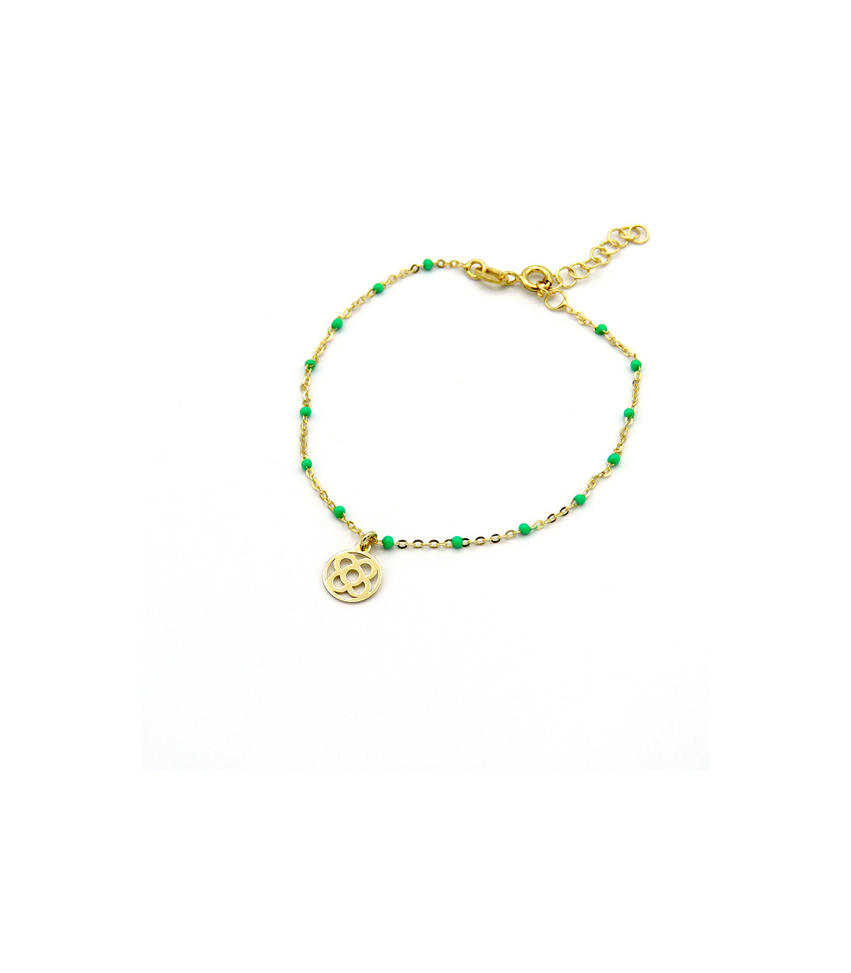 Aquesta polsera està feta amb la cadena amb toc de color amb esmalt verd o turquesa. Porta al mig el detall de la representació d'una flor, disseny propi d'una rajola típica dels carrers de Barcelona.