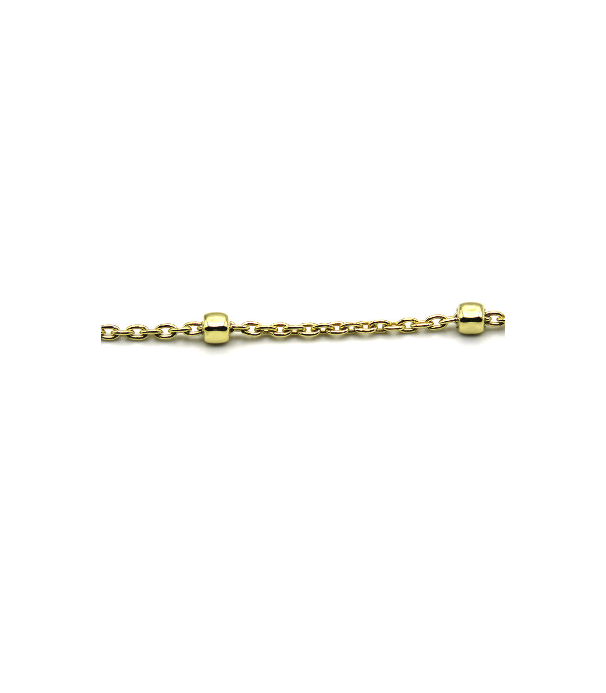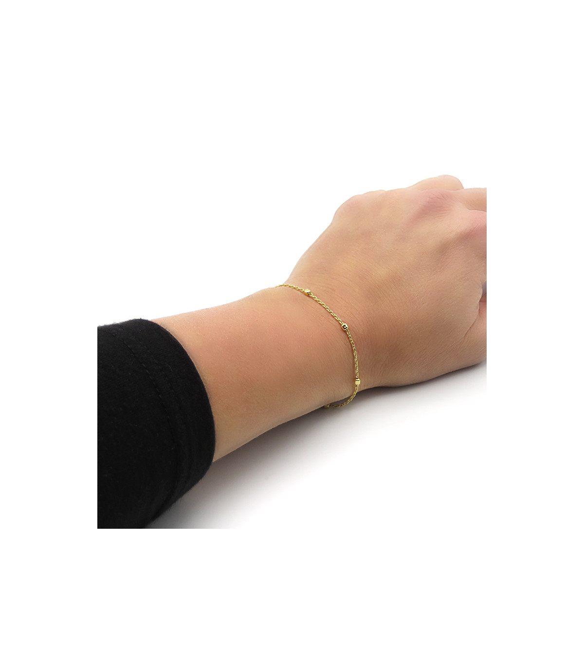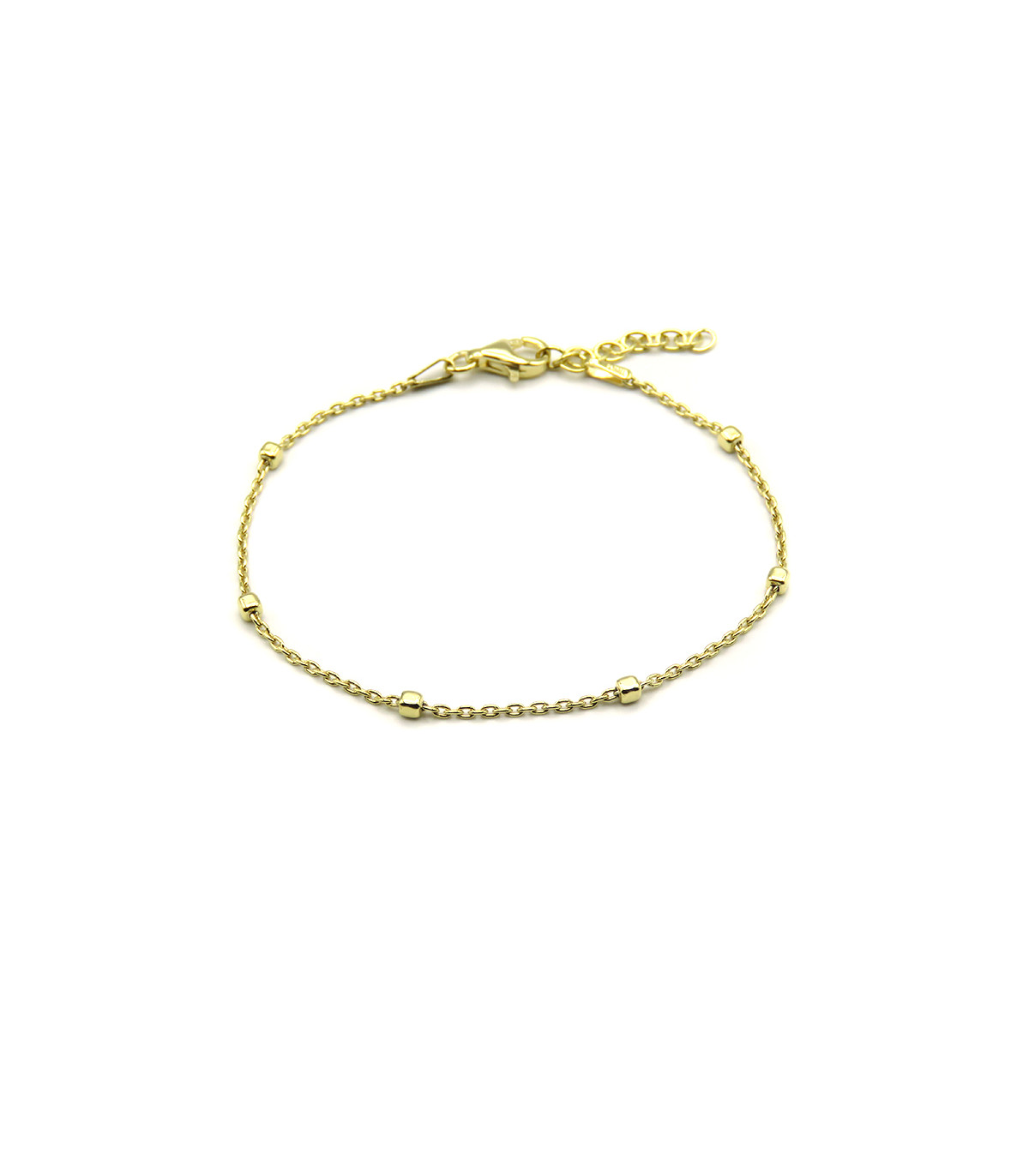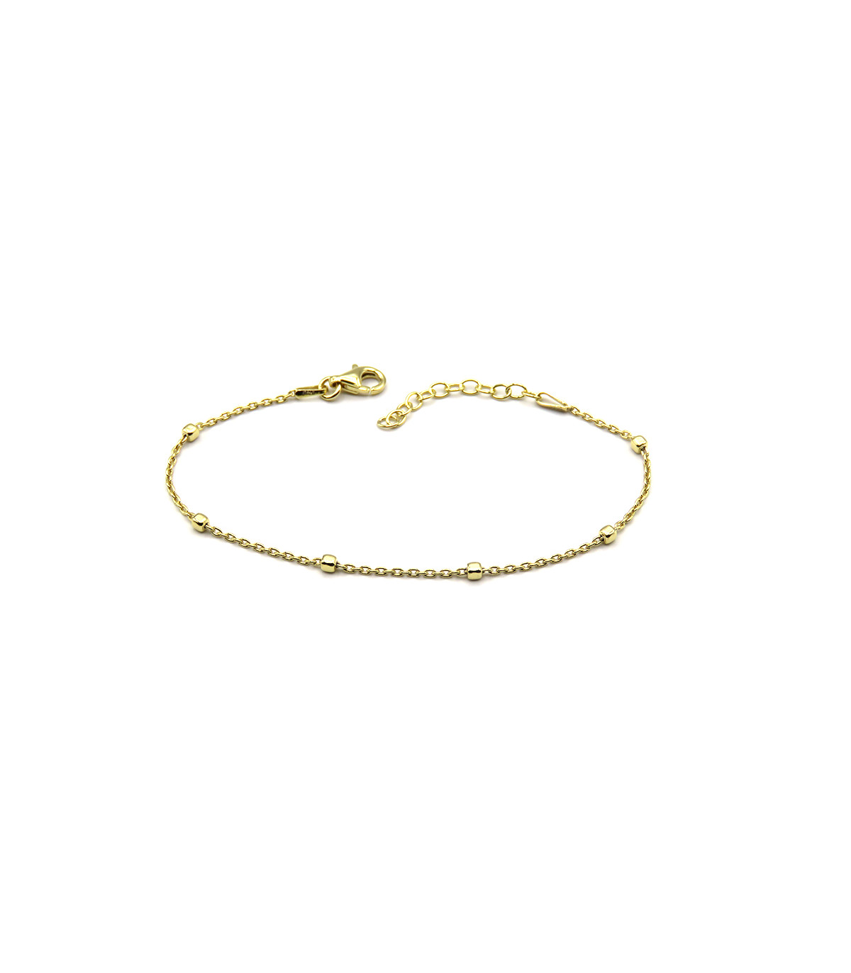 925 sterling silver and 18 K gold plated silver bracelets made with a 1 mm wide forced chain and six 2 mm cubes. The length of the bracelet is 15 cm plus a 3 cm extension, in total 18 cm long. The clasp is a secure carabiner clasp.
