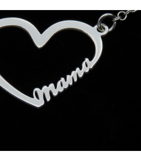 Heart-shaped pendant with the word "mama" in script font. Chain included.