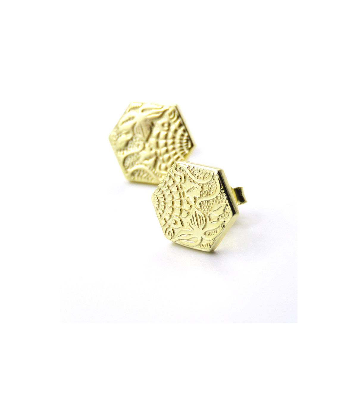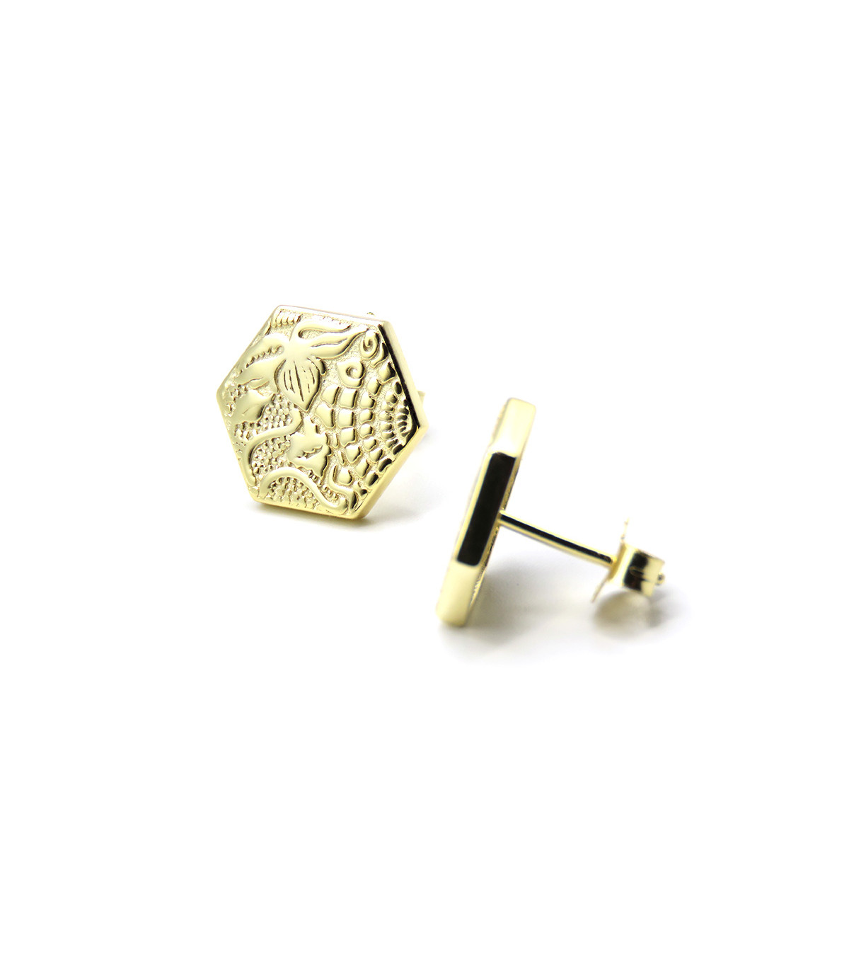 The earrings measure 15 mm from vertex to vertex and 6 mm on each side of the hexagon. The earrings are made of 925 sterling silver with 1 micron of polished 18K gold plating (relief of the figures) and with a matte finish on the bottom to delicately highlight the marine details.