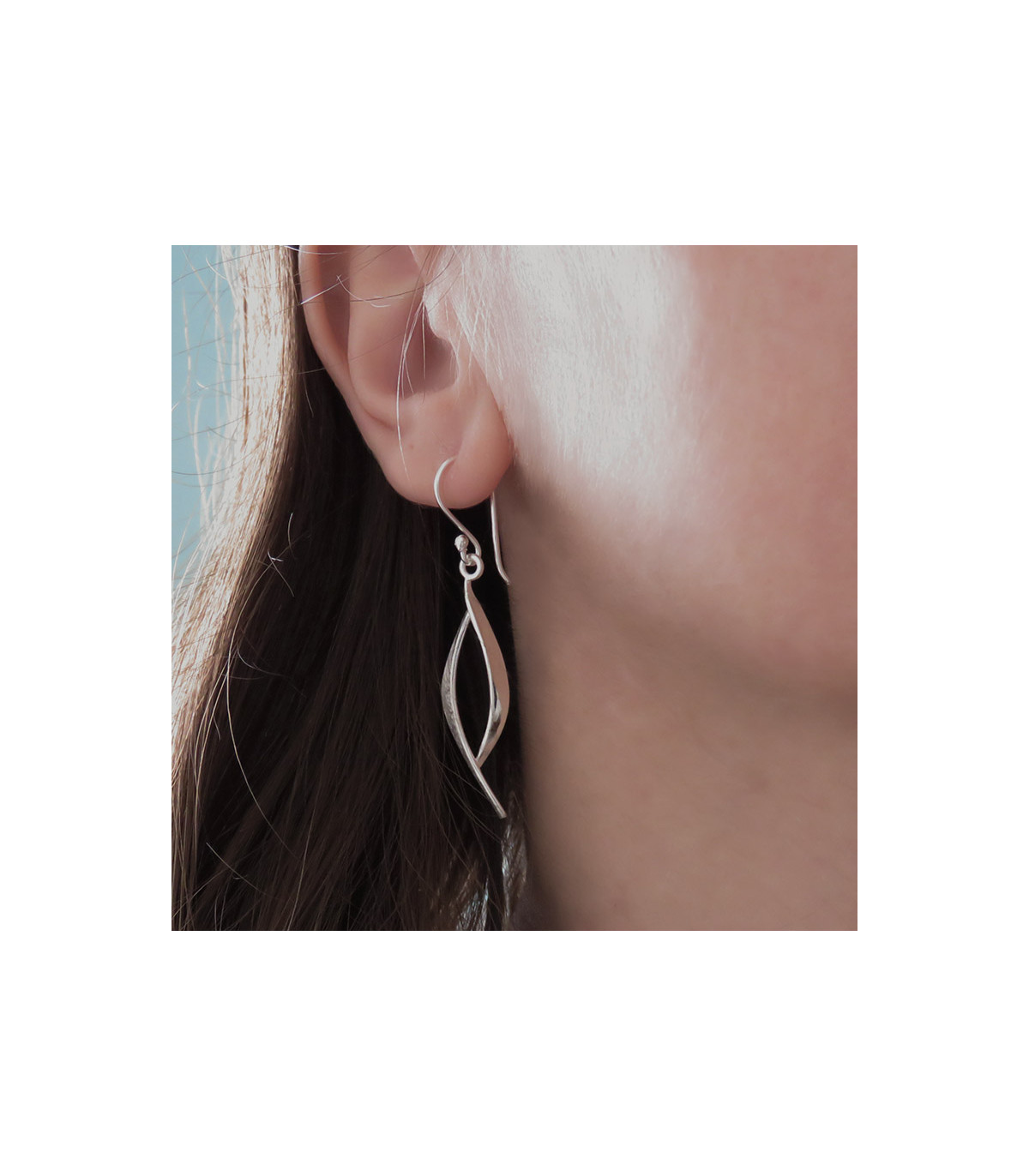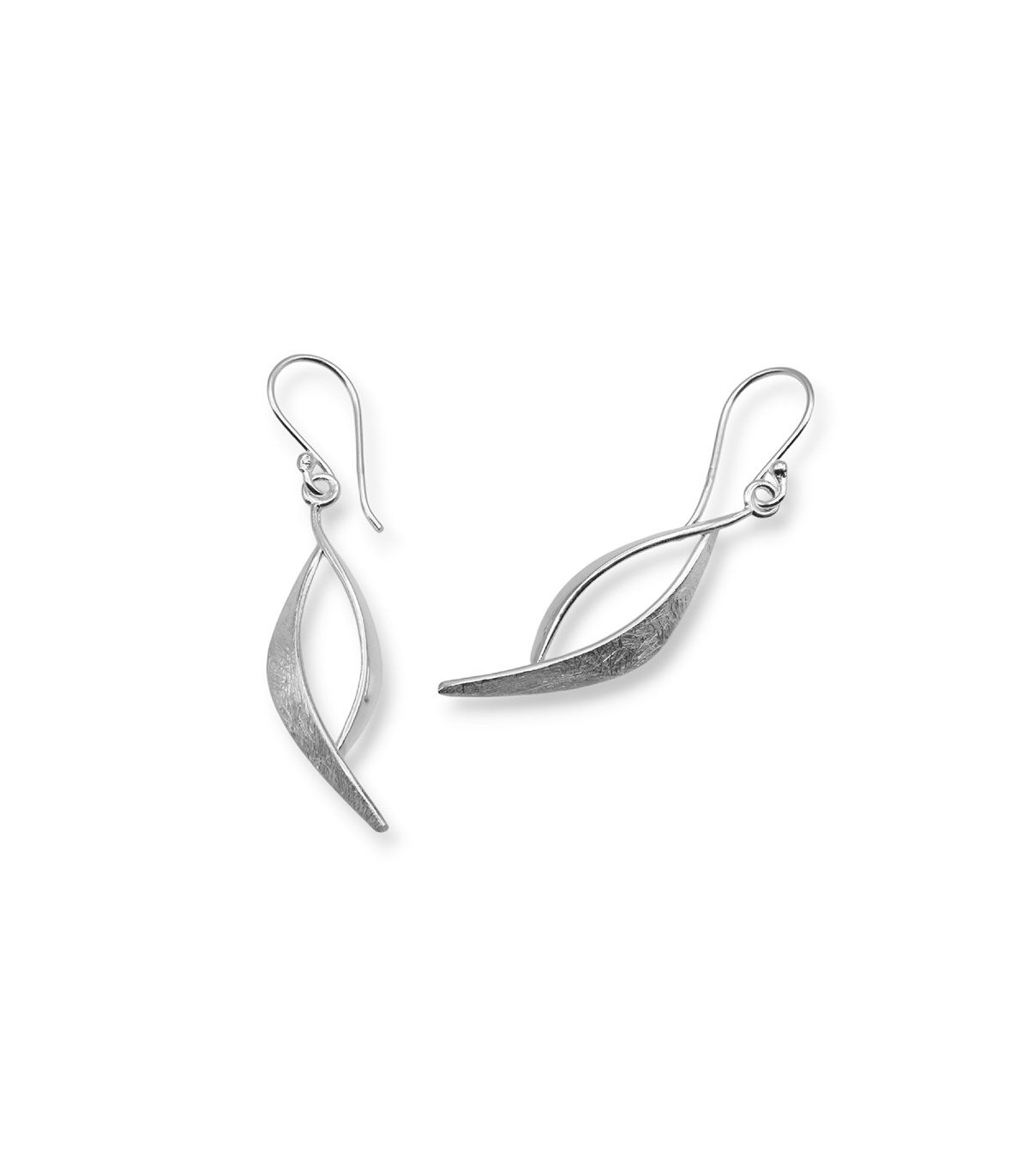 The Two Textures earrings are long earrings with a hook clasp (also known as a “hippie” clasp) from which two strands hang: one with a matte finish and the other, shorter strand with a mirror-like polished finish. They measure 53 mm in length (including the hook) and 10 mm in width (measured from the center, which is the widest part of the earring). The different textures of the earrings give them a contemporary look, yet they are timeless. They can be worn both for everyday use and for a special occasion. The earrings include silicone stoppers to secure them.