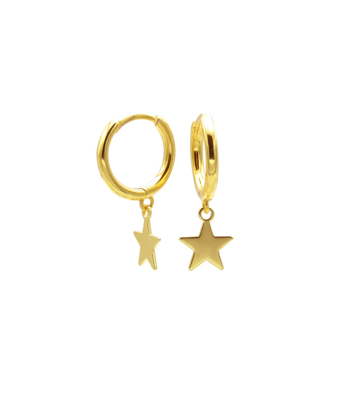 The Star earrings are 12mm diameter hoop earrings with a click closure and a hinge system. They have an 8mm dangling star from tip to tip.