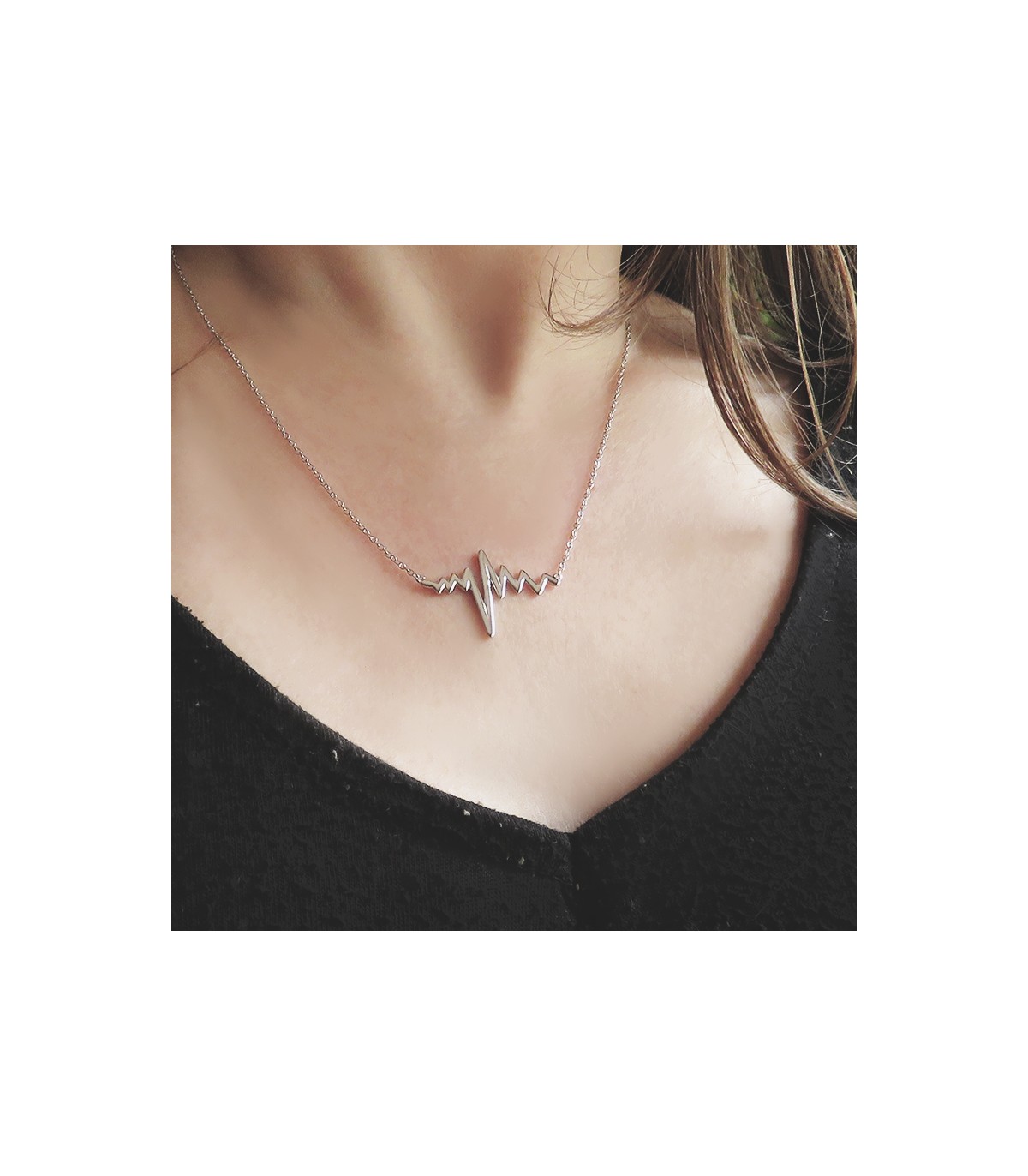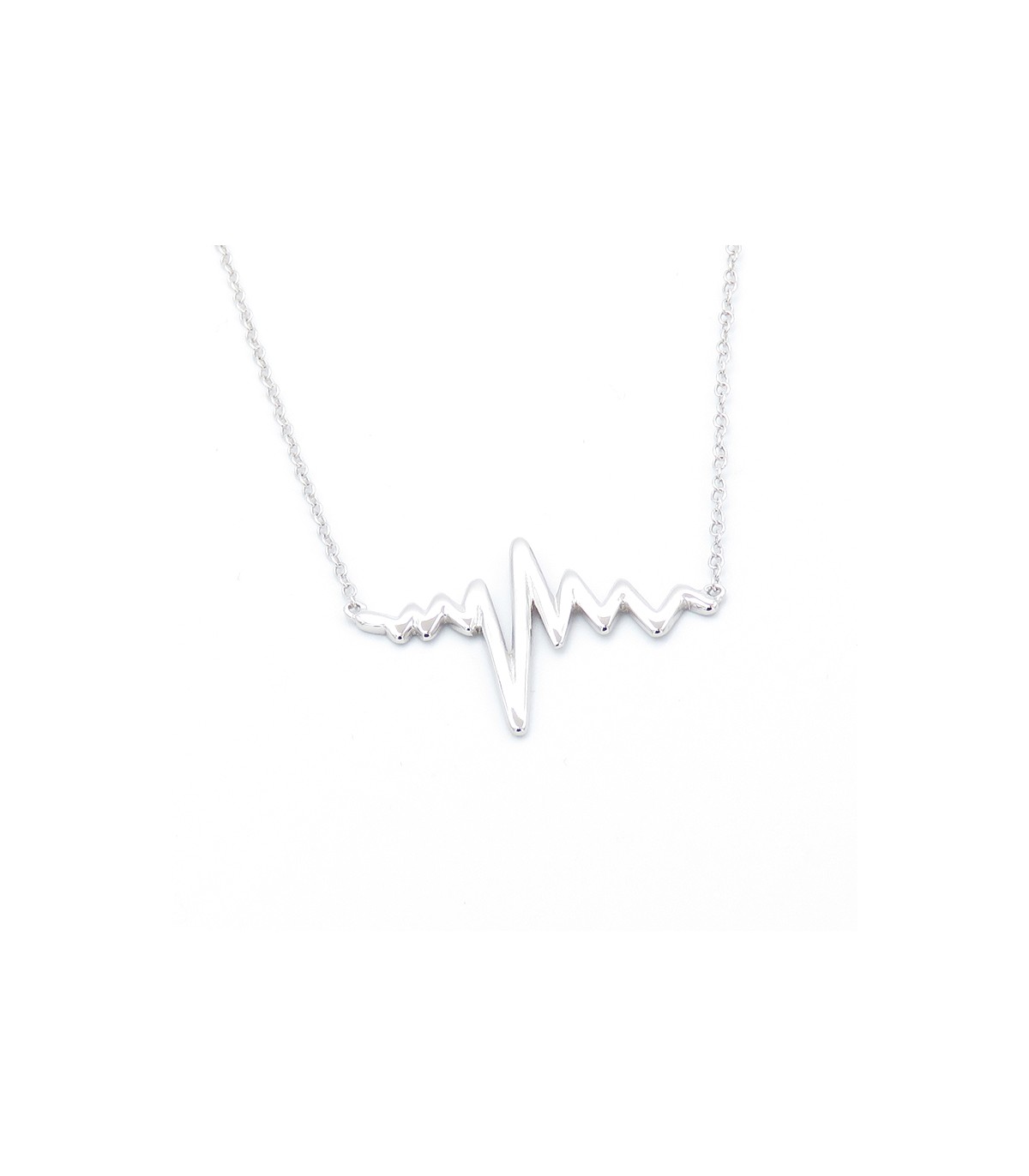 The Heartbeat necklace is a pendant with a representation of a heartbeat with an electrocardiogram line attached by the chain on the sides. The size of the pendant is 25 mm wide by 19 mm high. The length of the pendant chain is 40.5 cm plus 3 cm, adjustable.