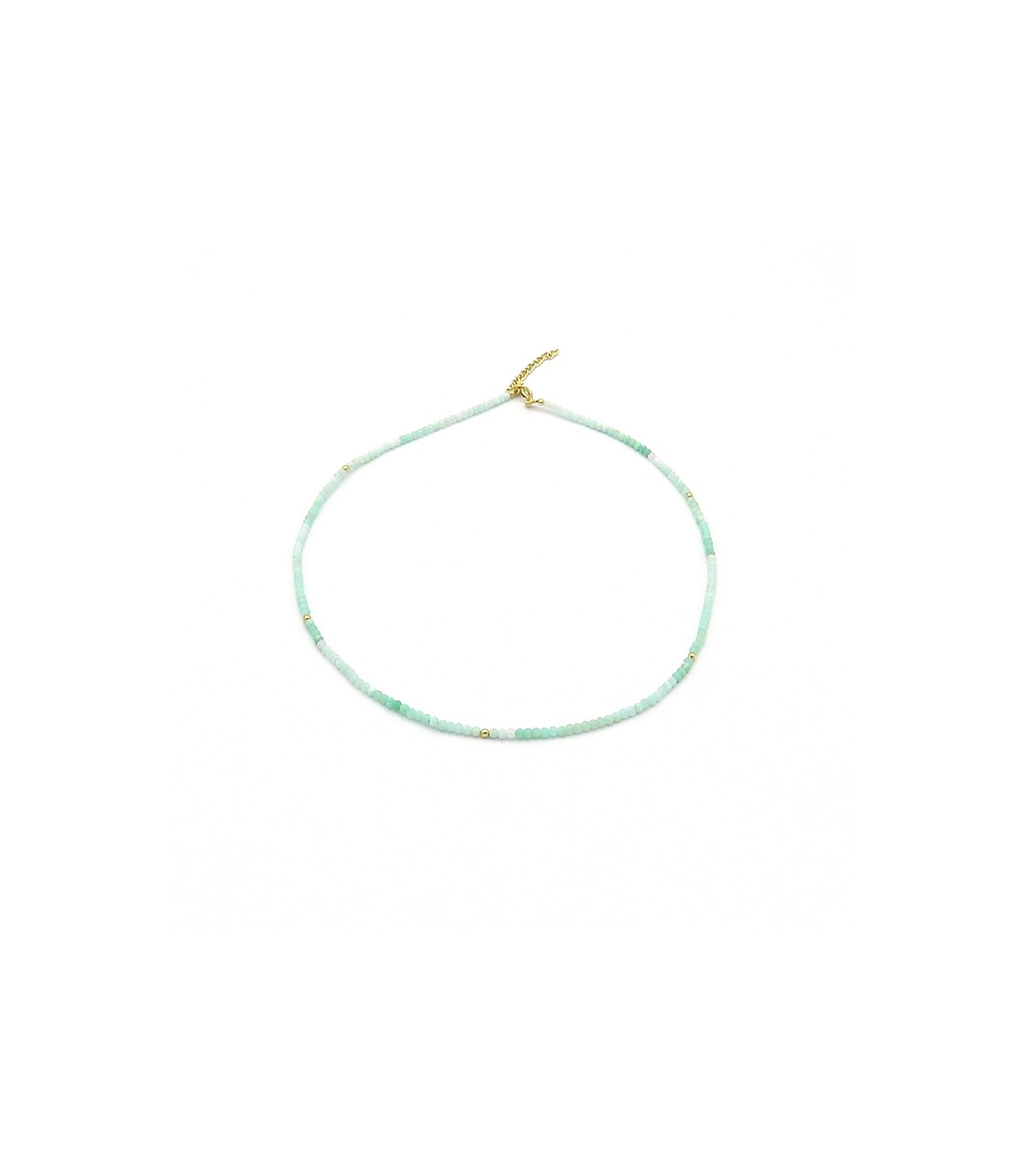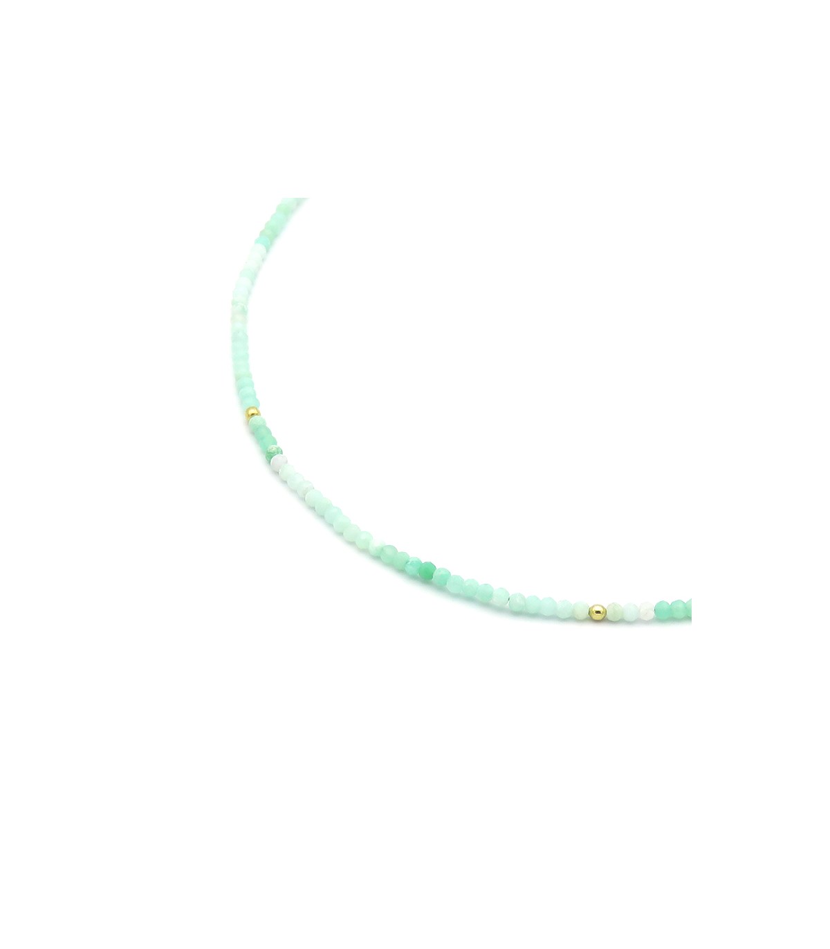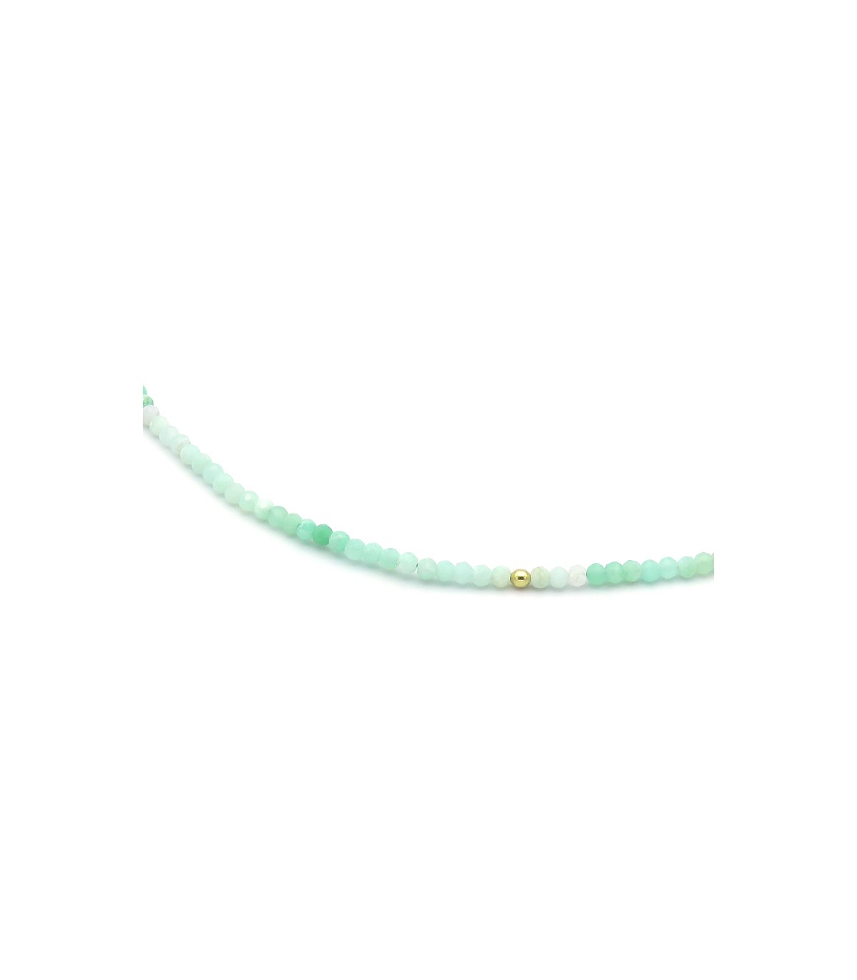The Chrysoprase necklace is made of 2 mm diameter minerals of the same name and 18K gold plated silver beads which gives it an elegant, modern, casual and summery touch. It is ideal to wear as a single piece or with other longer necklaces.