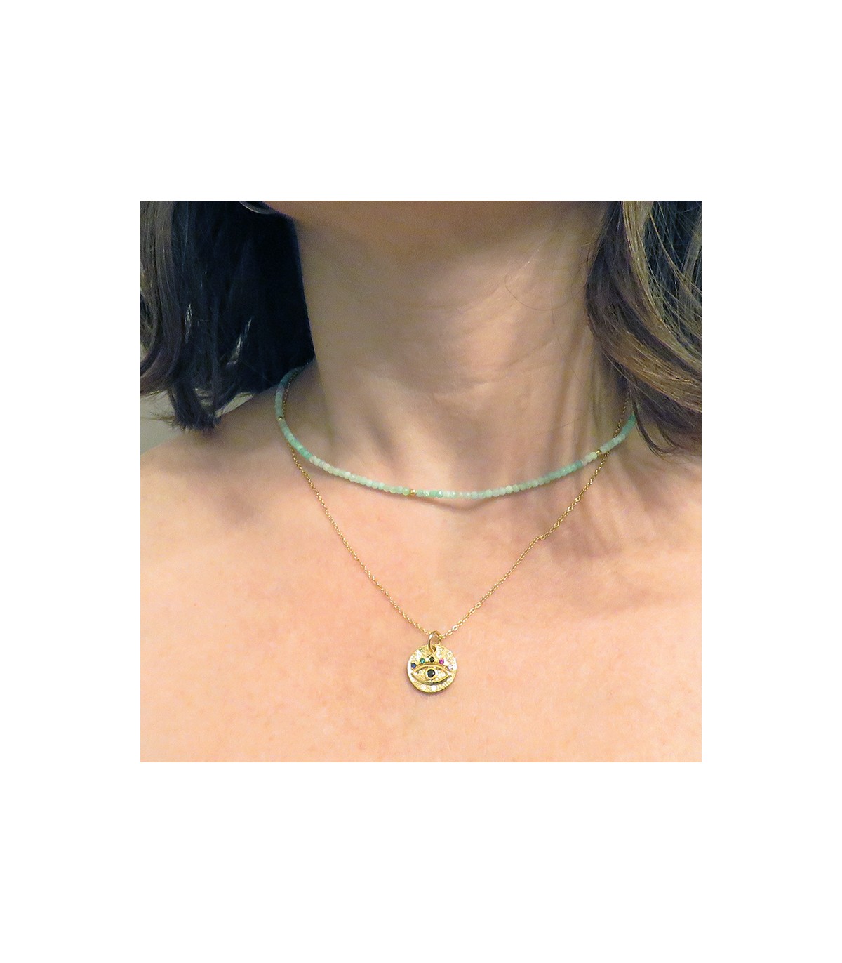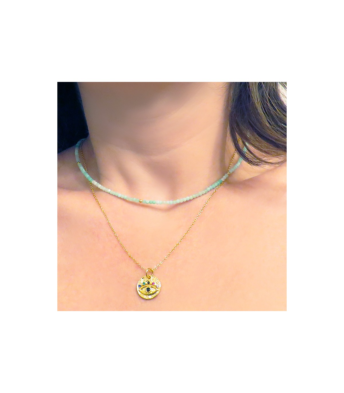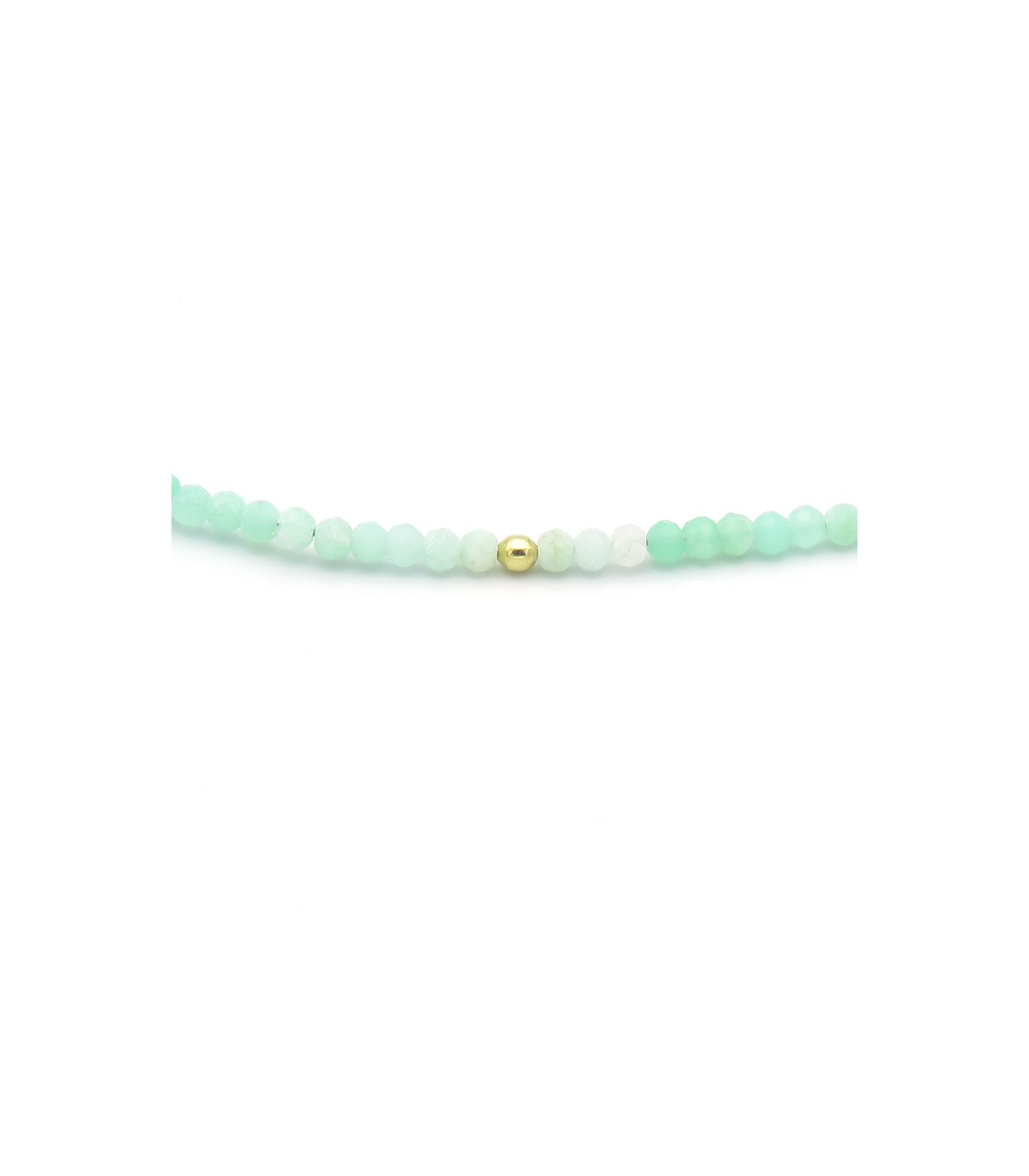 The Chrysoprase necklace is made of 2 mm diameter minerals of the same name and 18K gold plated silver beads which gives it an elegant, modern, casual and summery touch. It is ideal to wear as a single piece or with other longer necklaces.