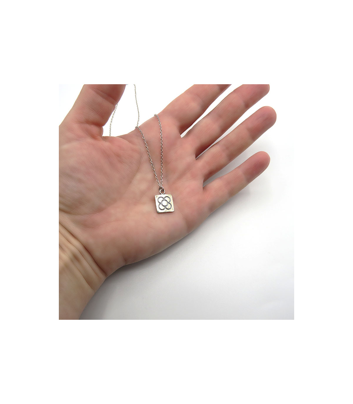 The size of the pendant is 11 x 11 mm and 1 mm thick and it has a 40 cm long rhodium-plated silver chain included with the possibility of 45 cm.