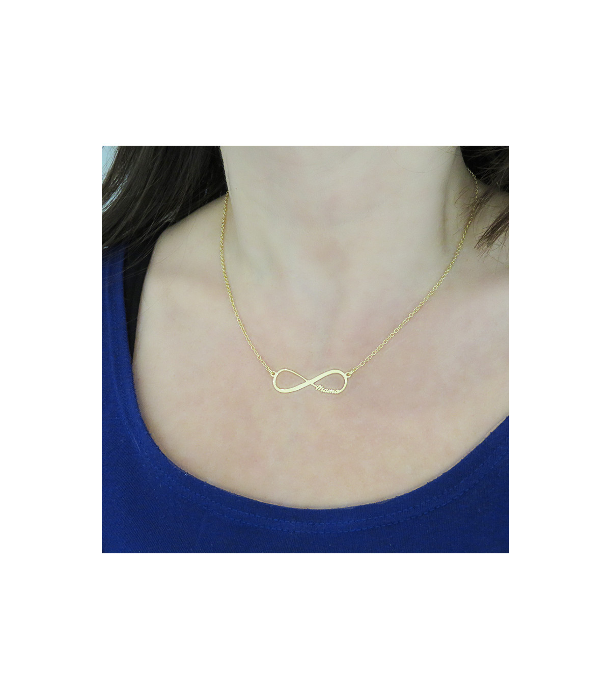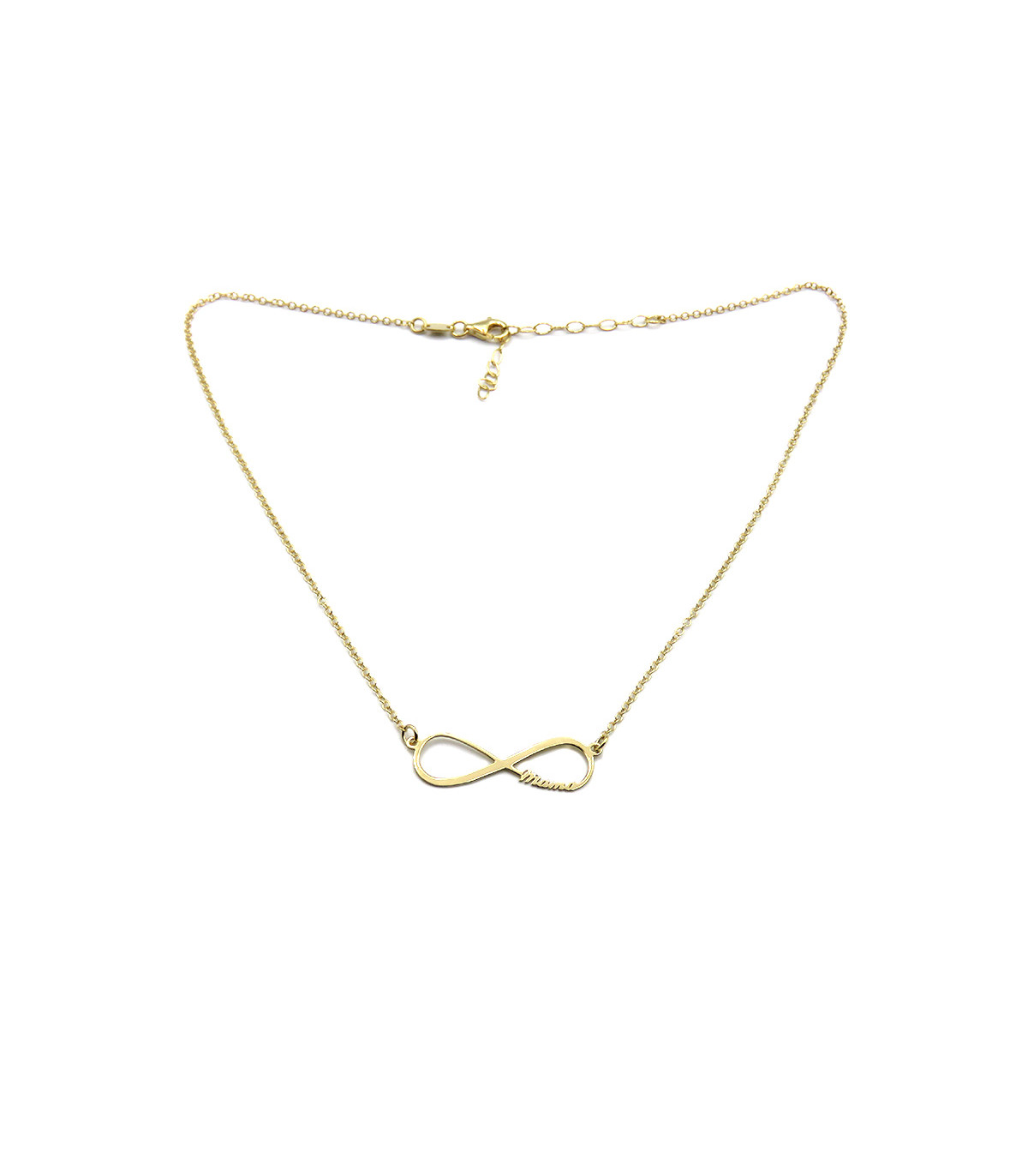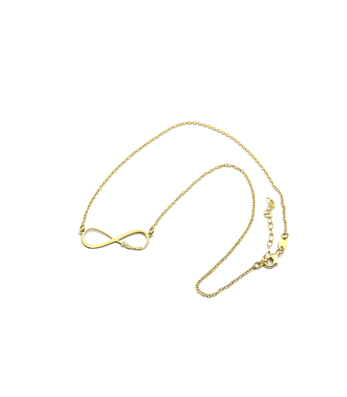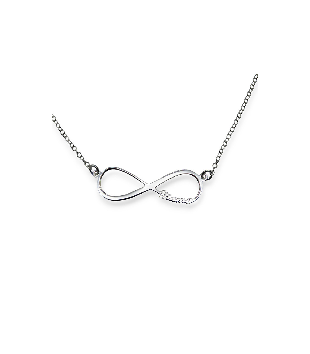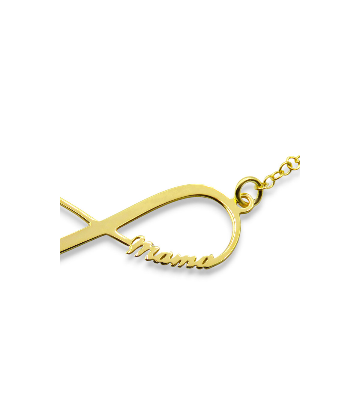 The Infinity Mama necklace is a pendant in the shape of an infinity with the word ‘mama’ written on one side in script font with a chain holding it on the sides. The size of the infinity is 30 mm wide by 10 mm high with a thickness of 2 mm. The length of the pendant chain is 38 cm plus 5 cm, adjustable.