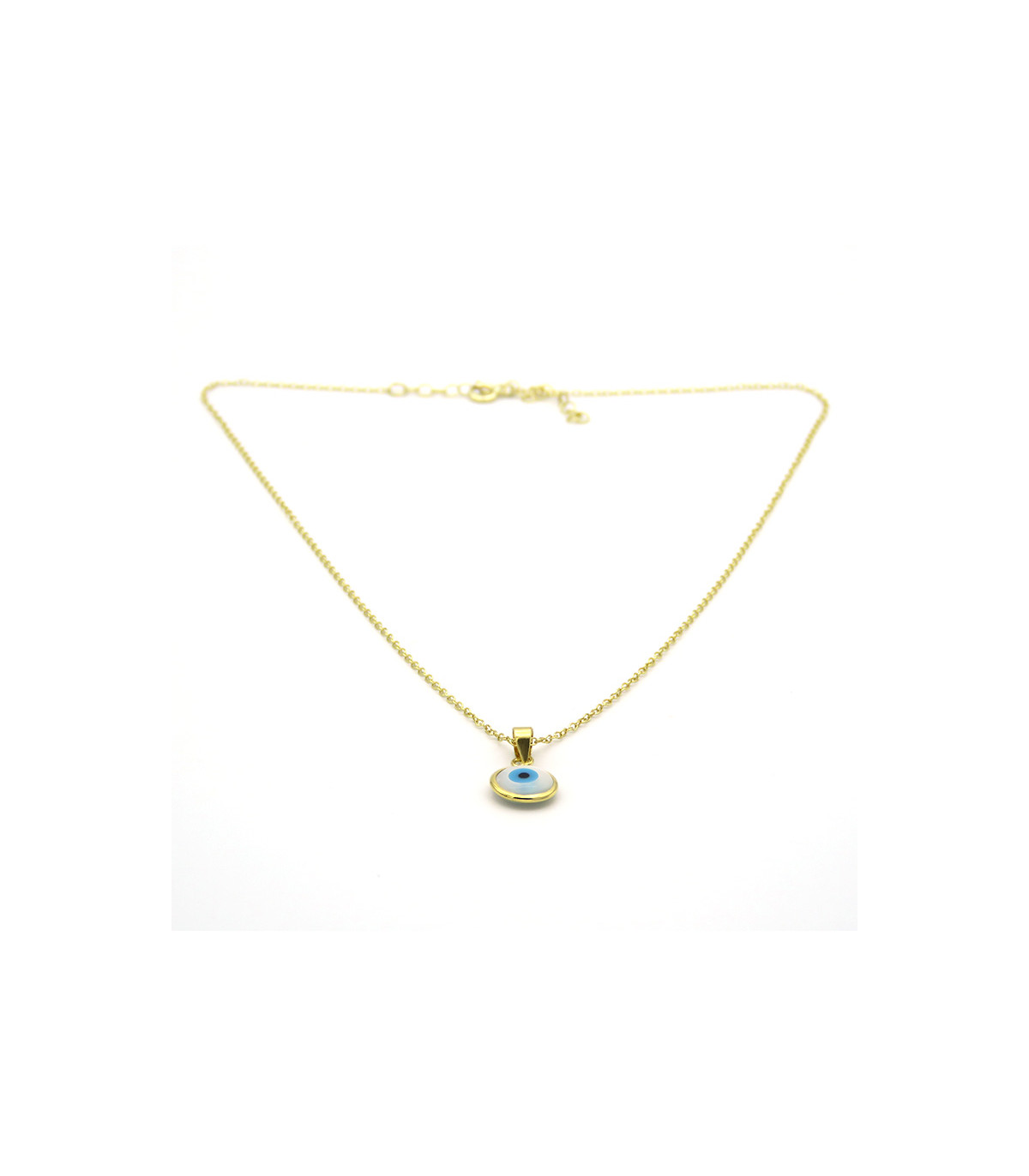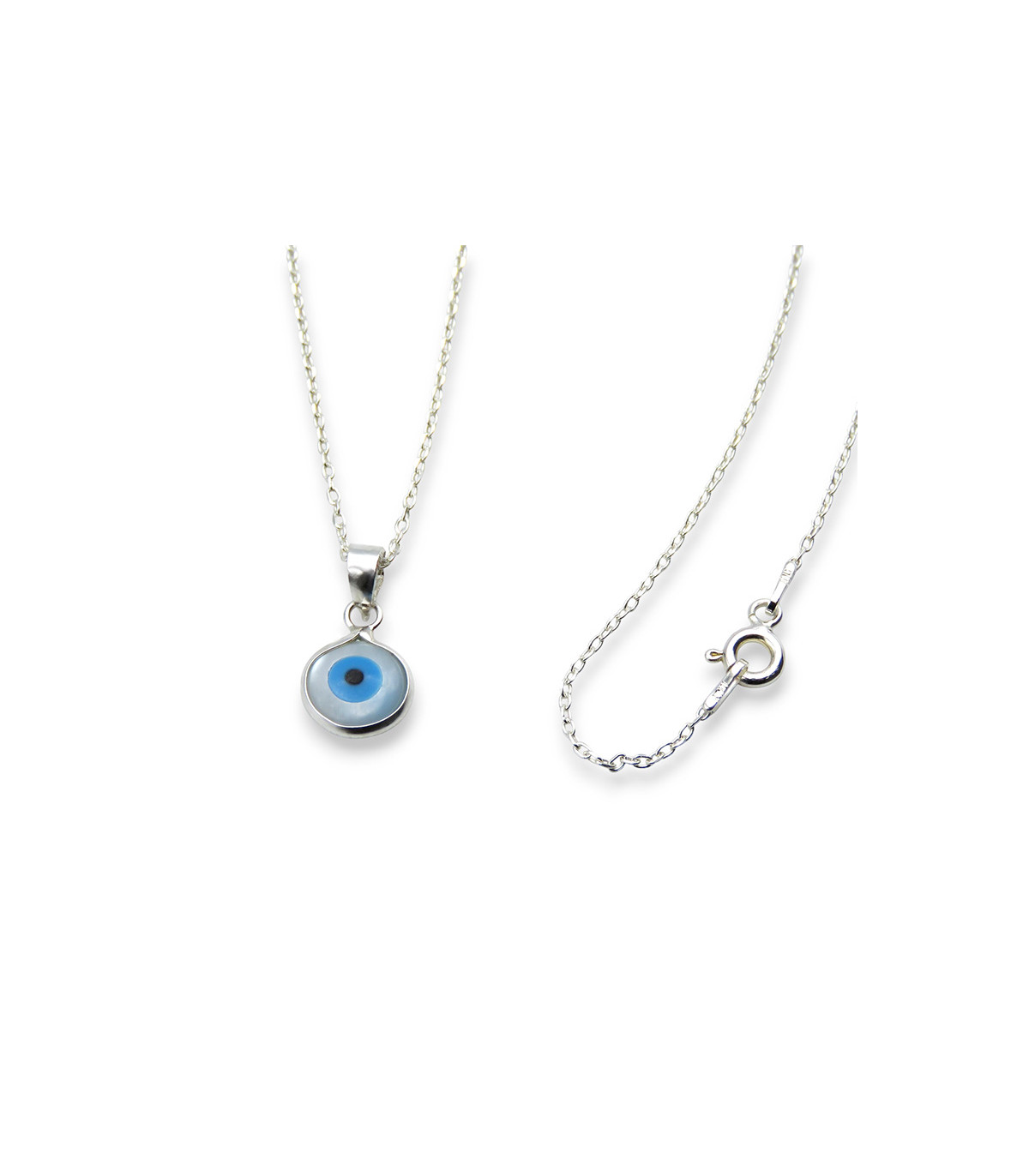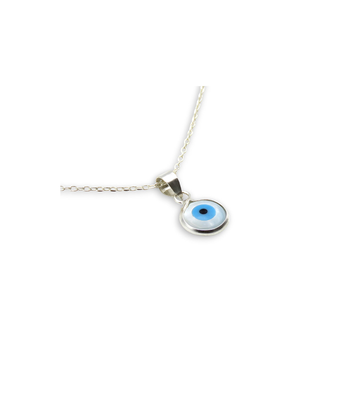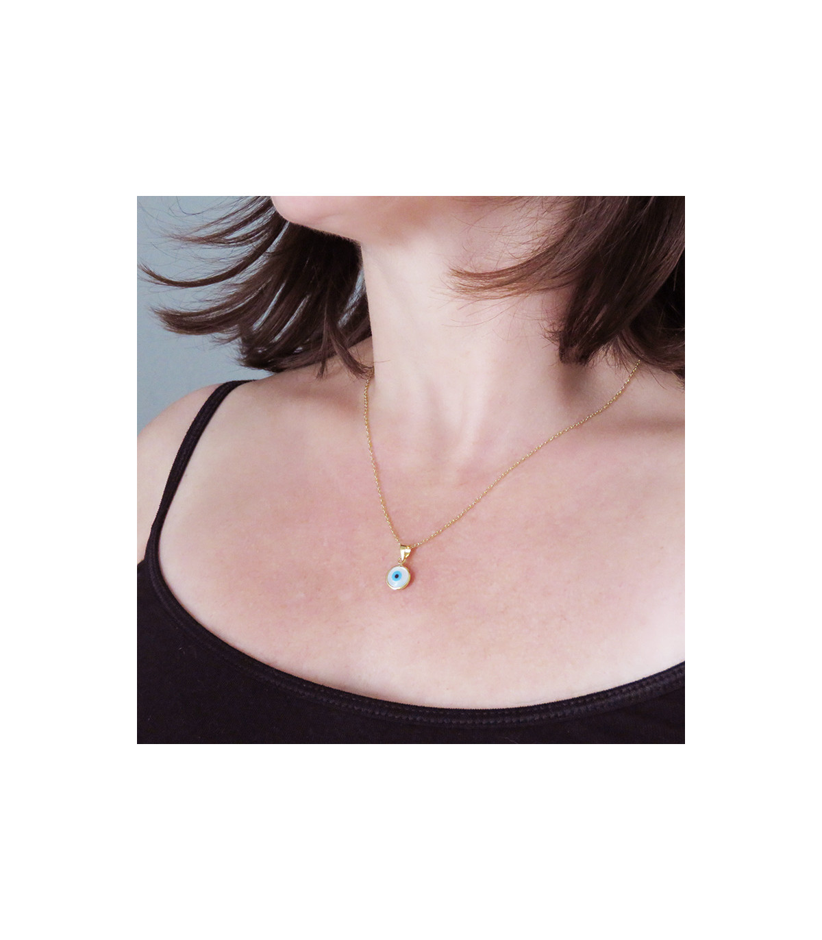 The Turkish Eye, Greek or also called Nazar pendant is made of a piece of white mother-of-pearl and blue iris. The size of the pendant is 9 mm in diameter and 16 mm high if the washer is included. The chain is 40 cm or 45 cm to choose.