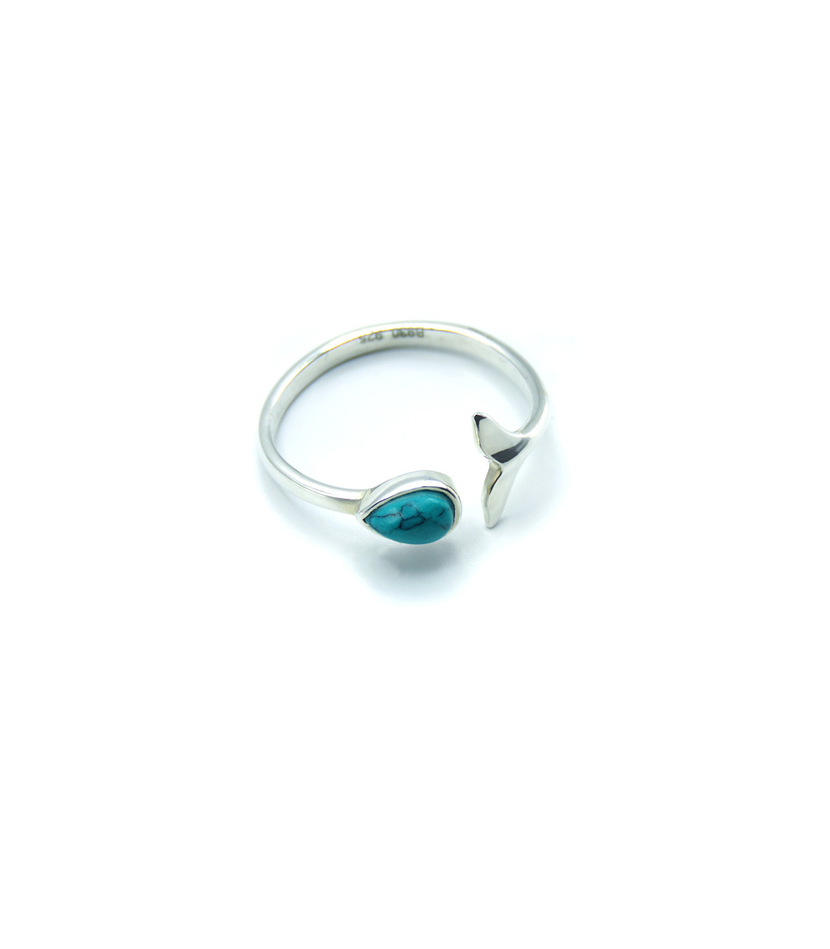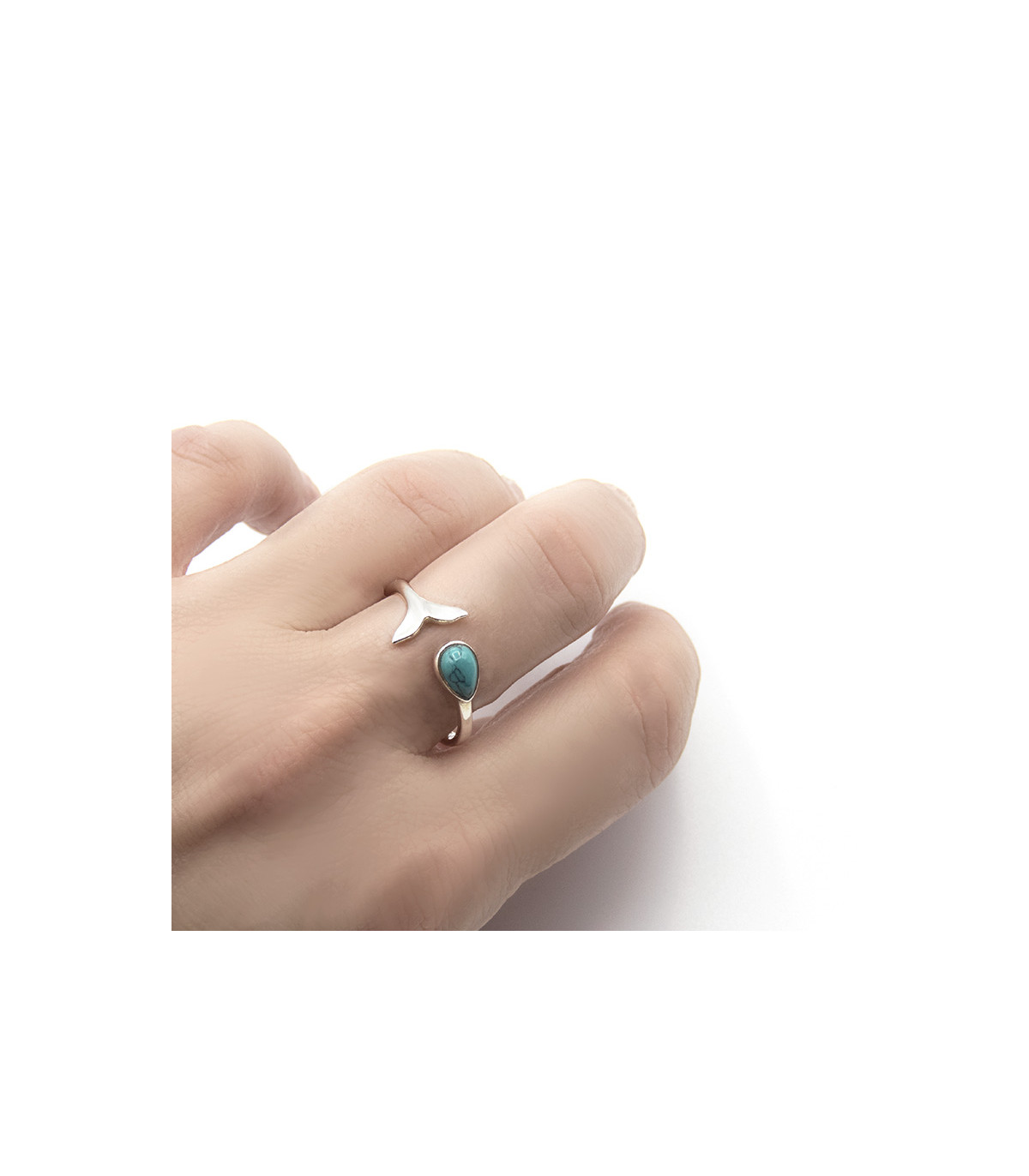 The Whale Tail ring is composed of a 2 mm ring that ends on one side with a 9 mm wide whale tail shape and on the other side with a natural turquoise teardrop-shaped 4 mm wide and 7 mm long. The ring is one size but as it is open it is adjustable between sizes 14, 16 or 17. It is an ideal ring for nature lovers and specifically the sea and its animals.