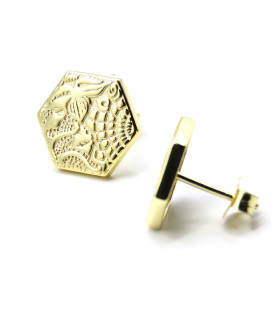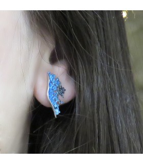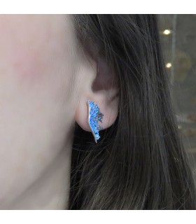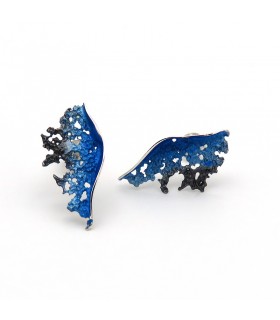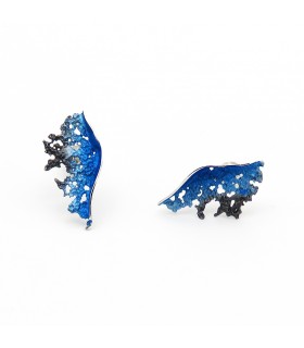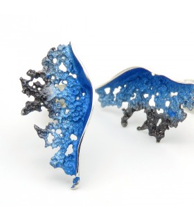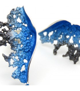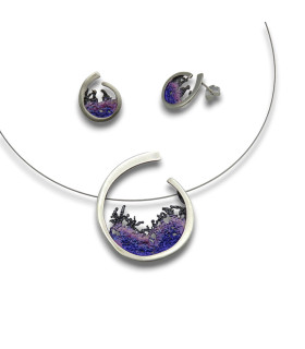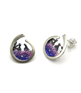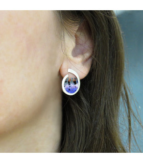 Pendientes de plata y pigmentos con forma redonda que representan una ola de color malva. Cierre de presión.