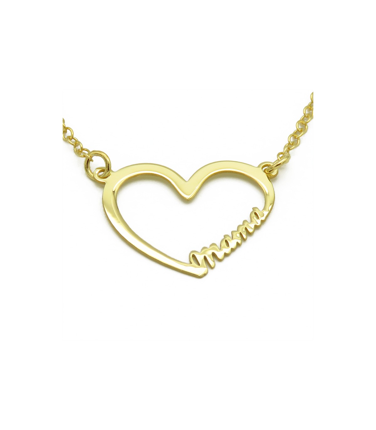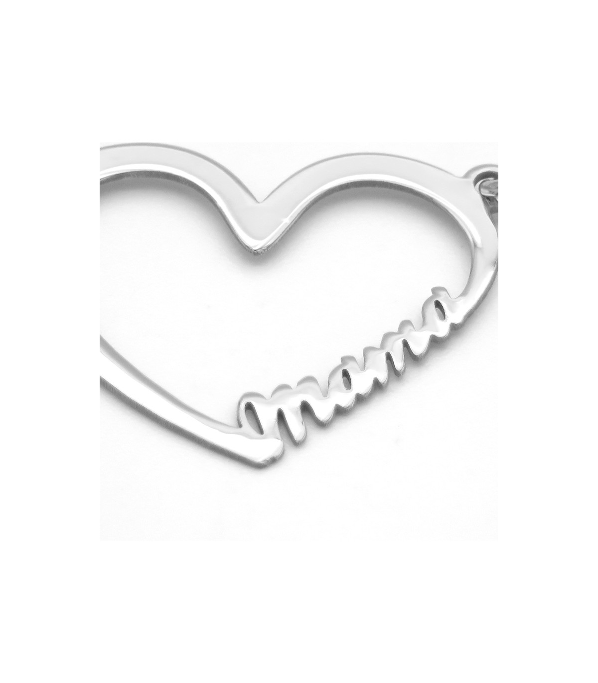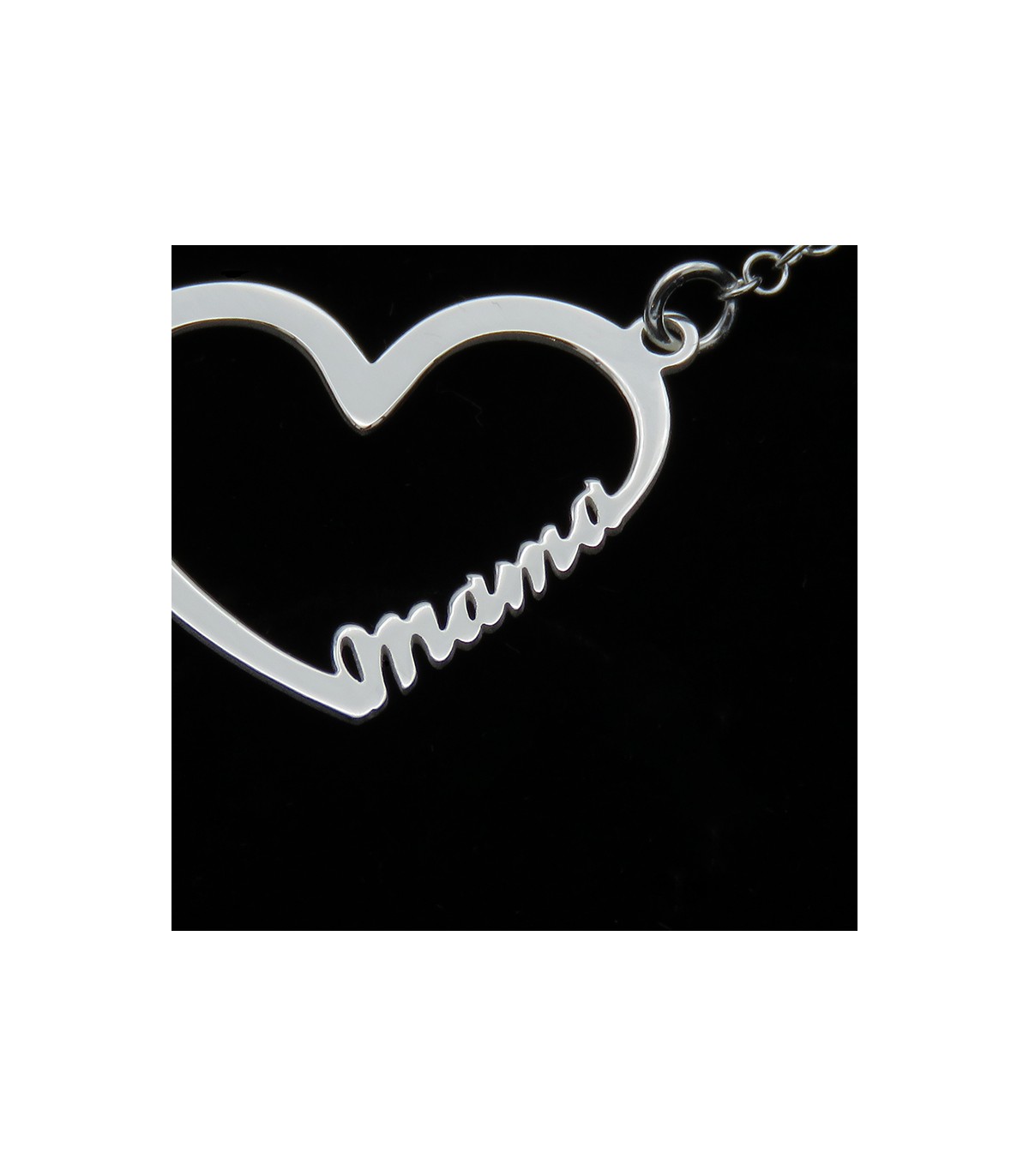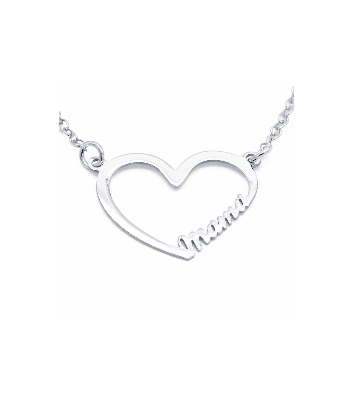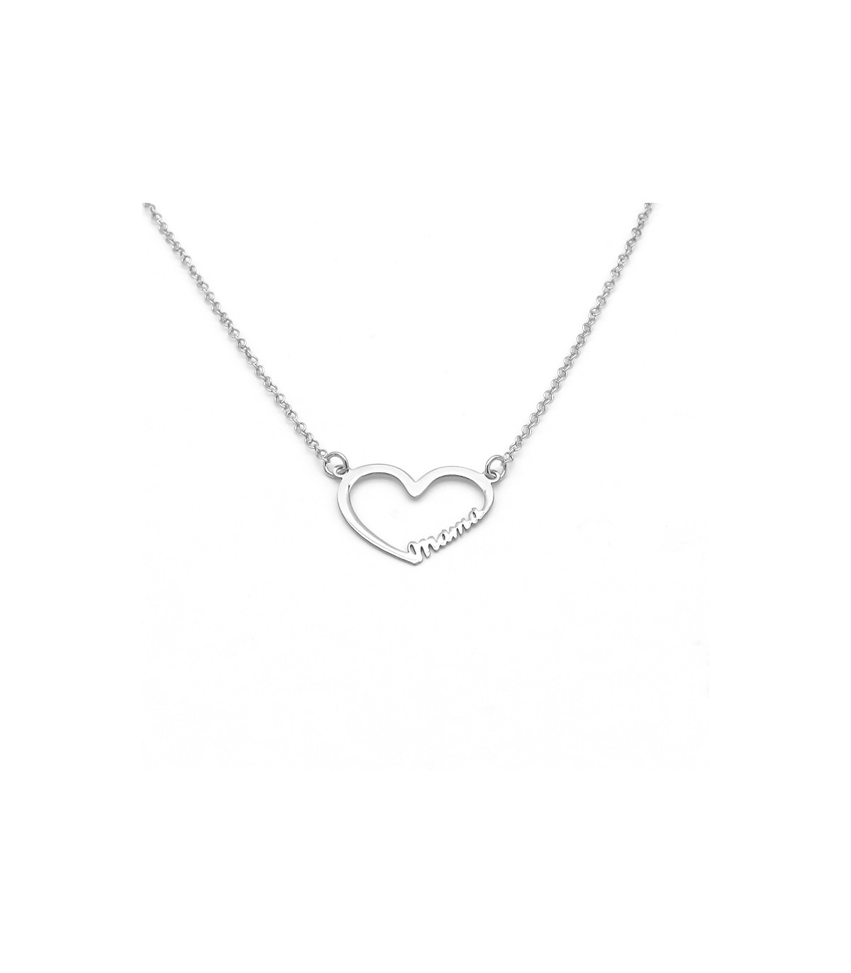 Colgante con forma de corazón y la palabra "mama" con tipo de letra script. Cadena incluida.