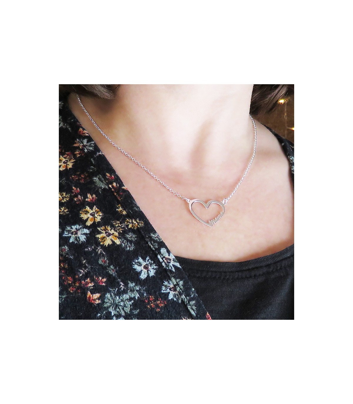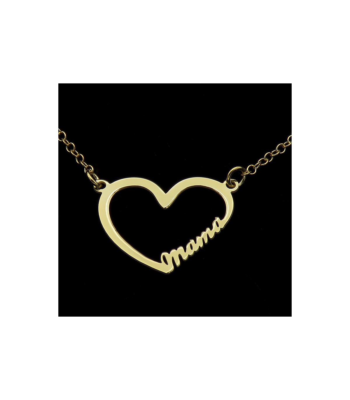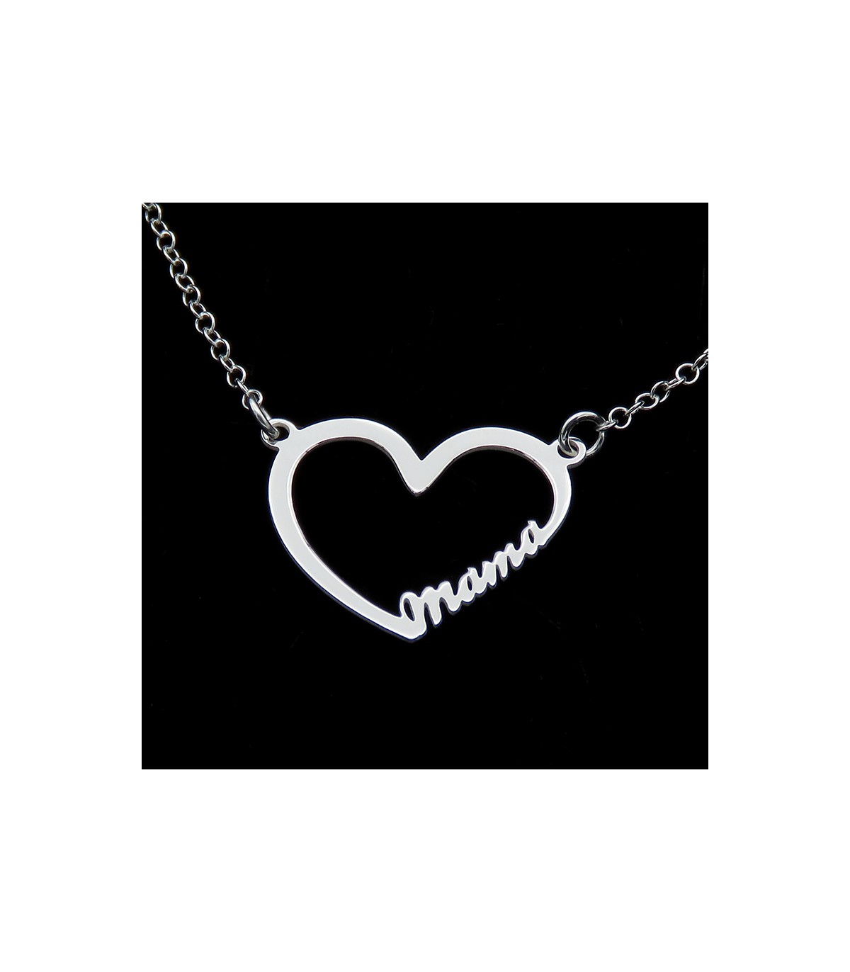 El collar Corazón Mama es un colgante con perfil de corazón y la palabra “mama” con tipo de letra script con una cadena que lo coge por los lados. La medida del corazón es de 20 mm de ancho por 20 mm de alto de un grosor de 2mm. El largo de la cadena del colgante es de 38 cm más 5 cm, ajustables.