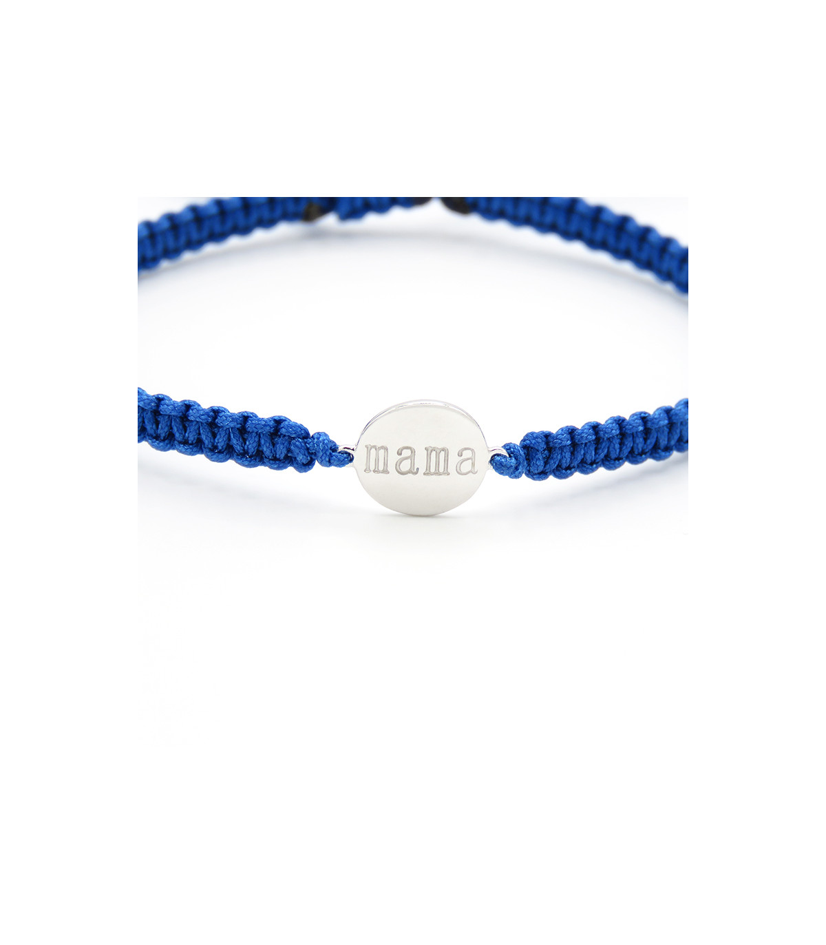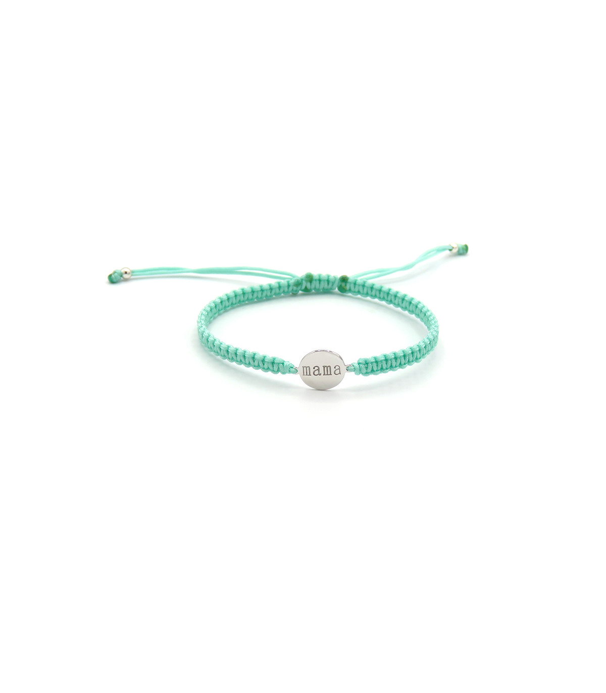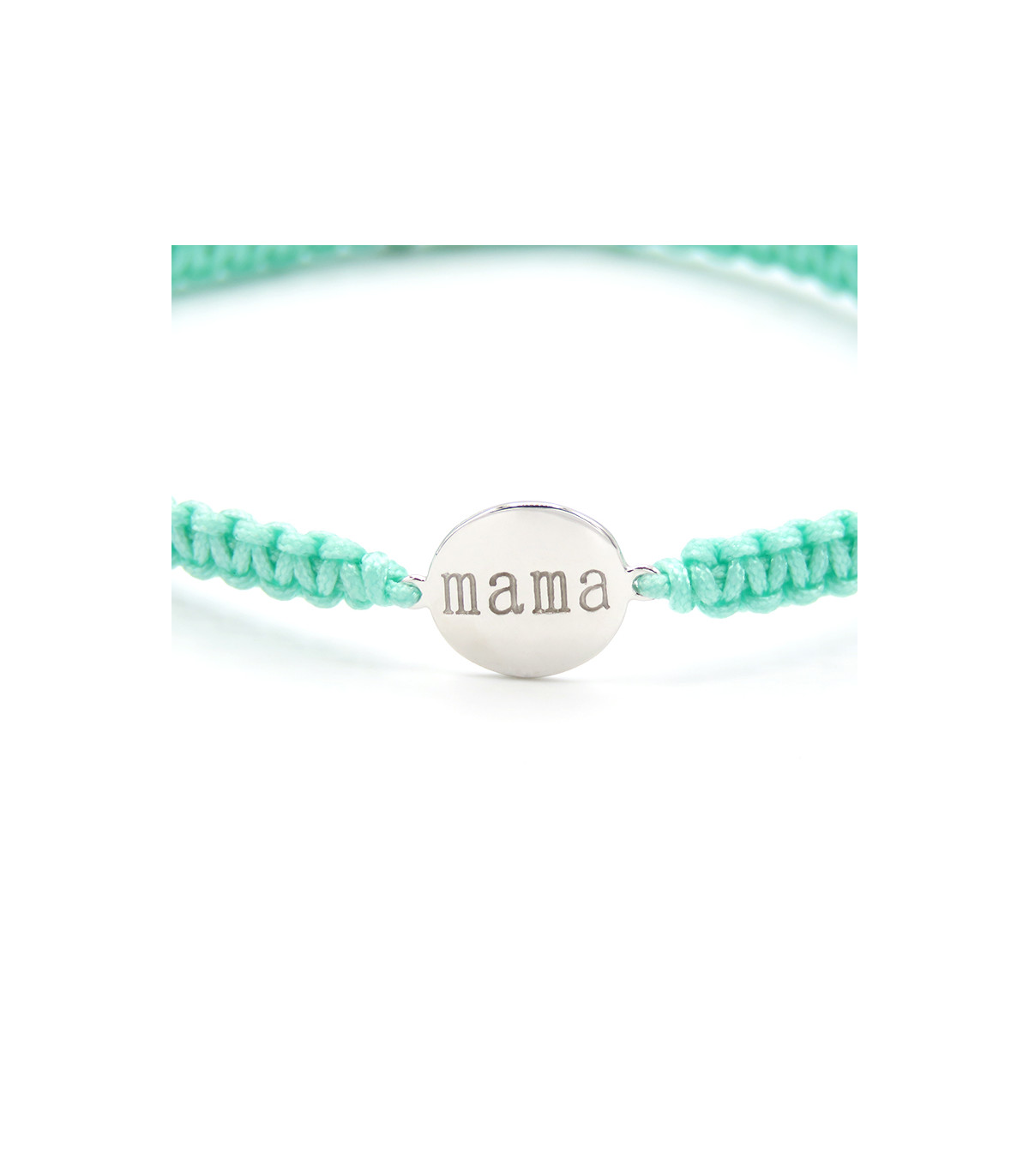 Pulsera con placa redonda con Mama grabado en su interior. Hecha de macramé ajustable.