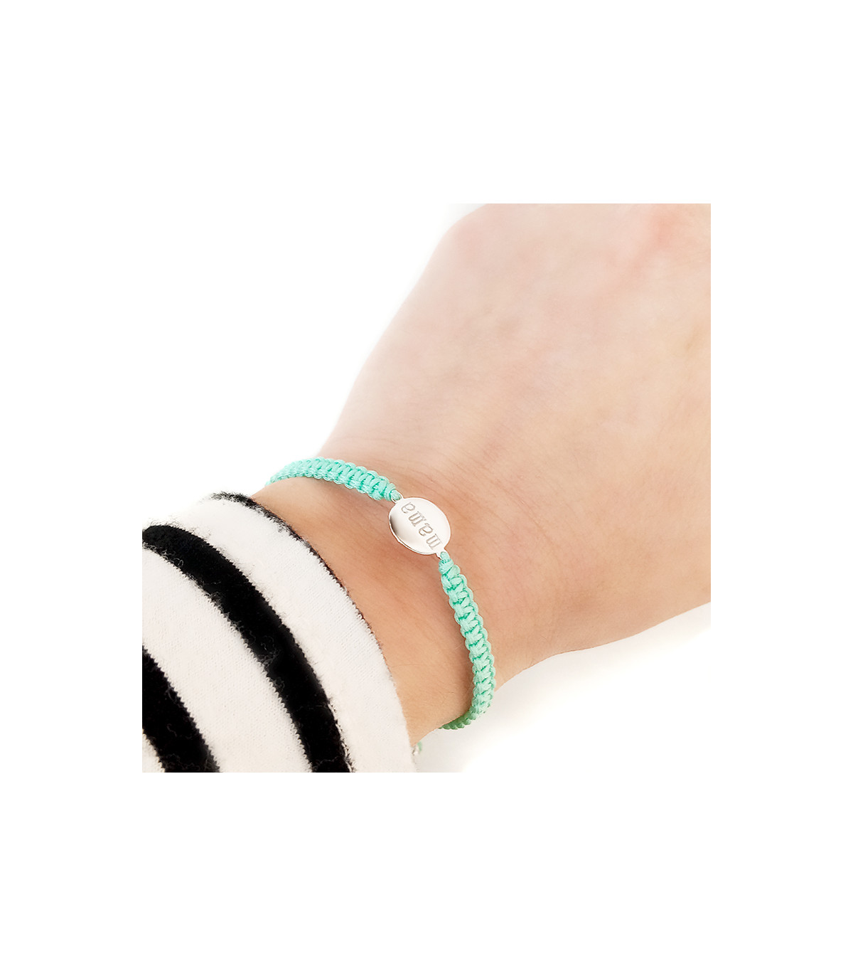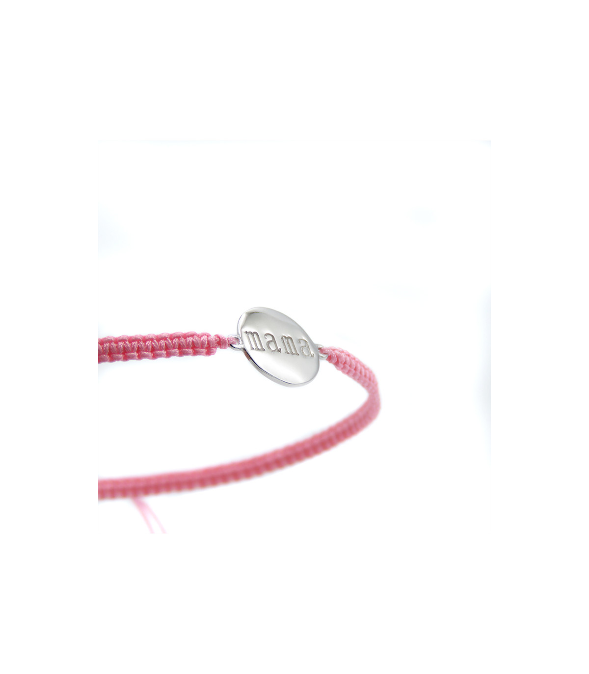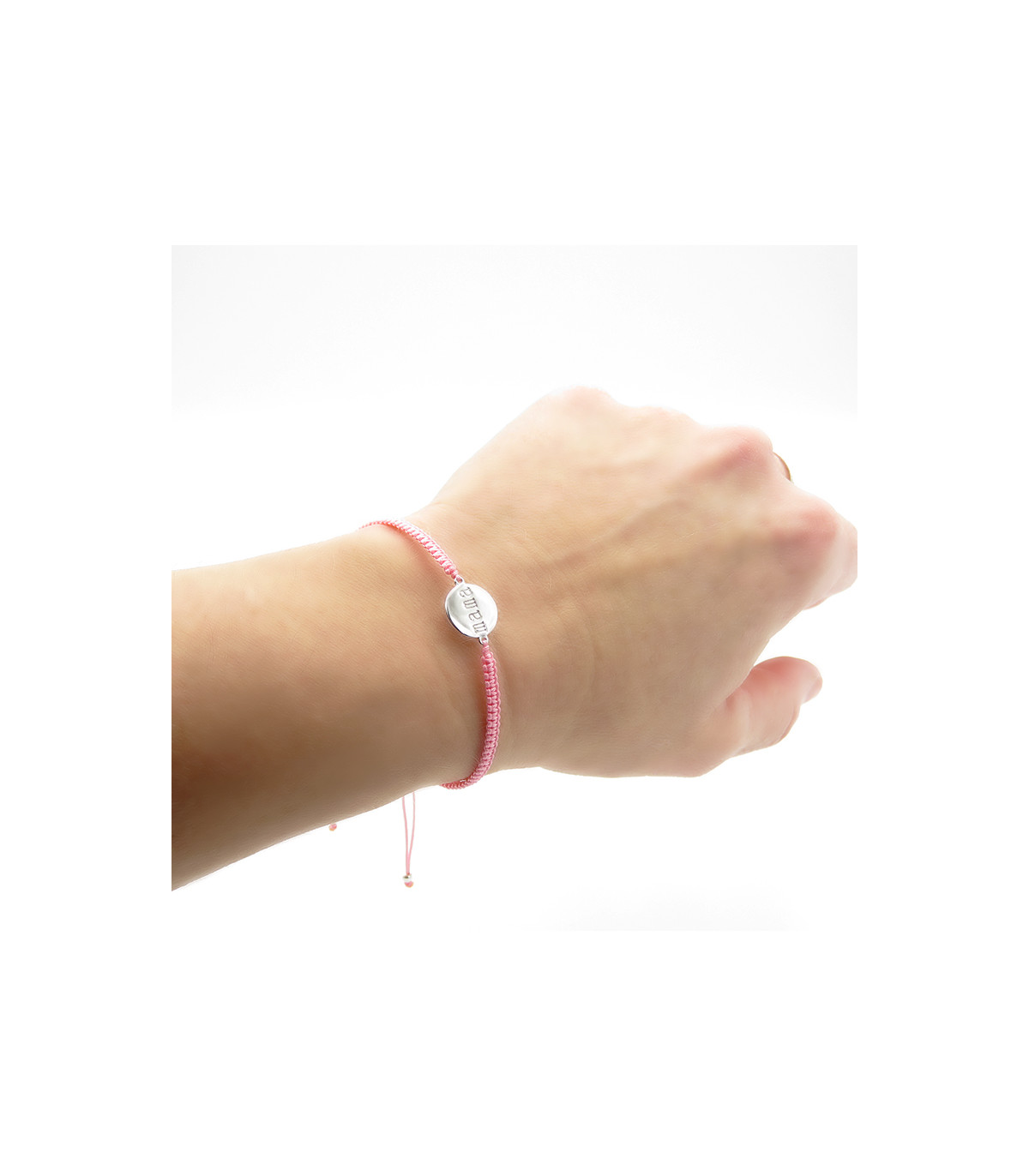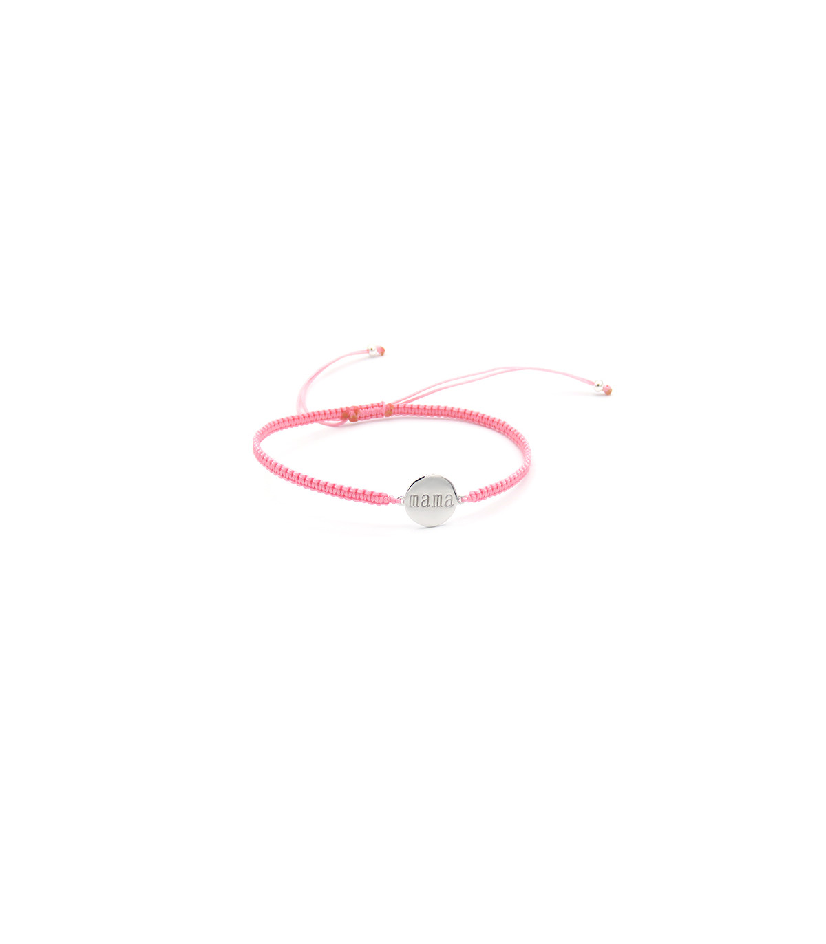 Pulsera con placa redonda con Mama grabado en su interior. Hecha de macramé ajustable.