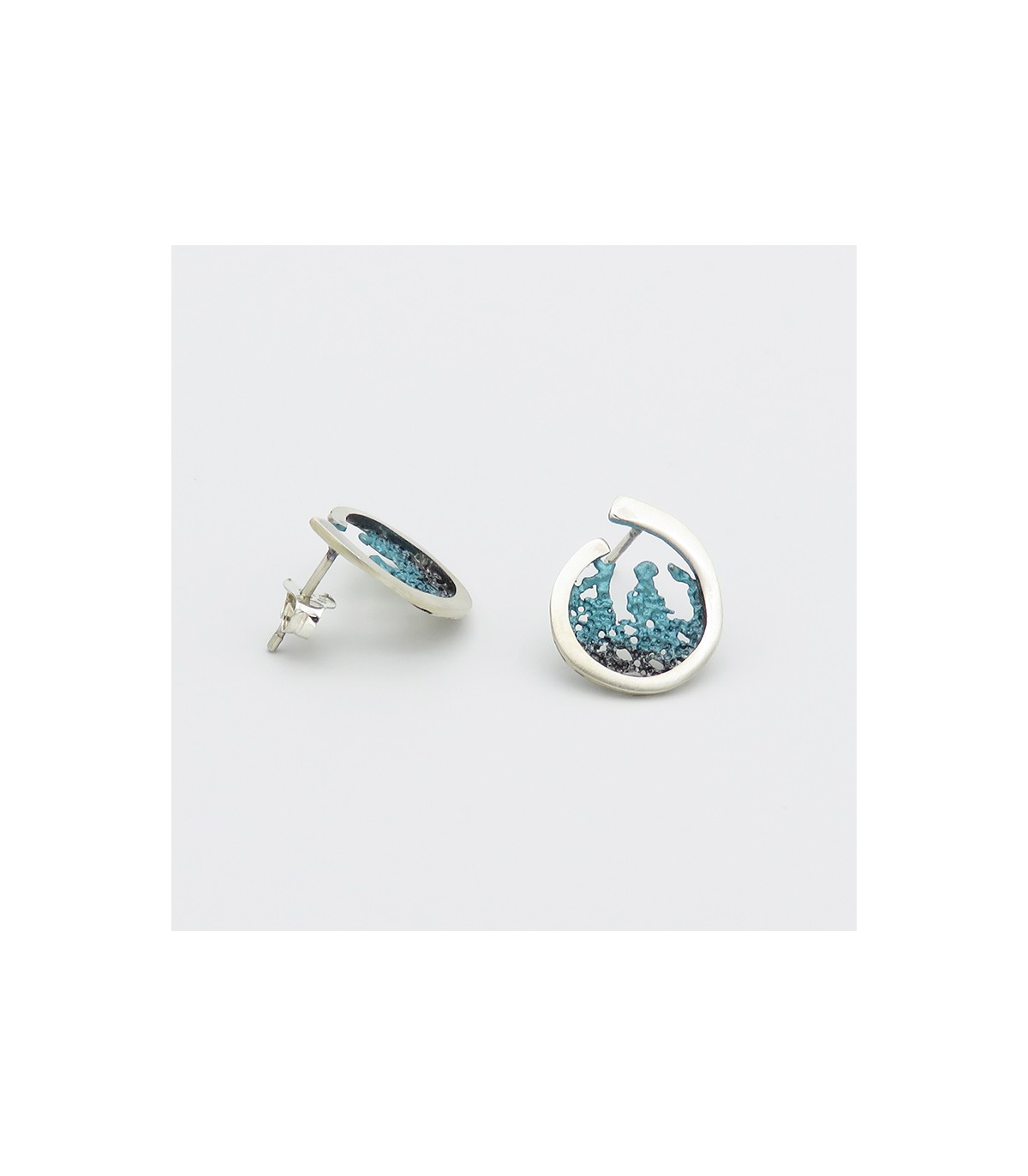 Pendientes de plata y pigmentos con forma redonda que representan una ola de color azul turquesa. Cierre de presión.