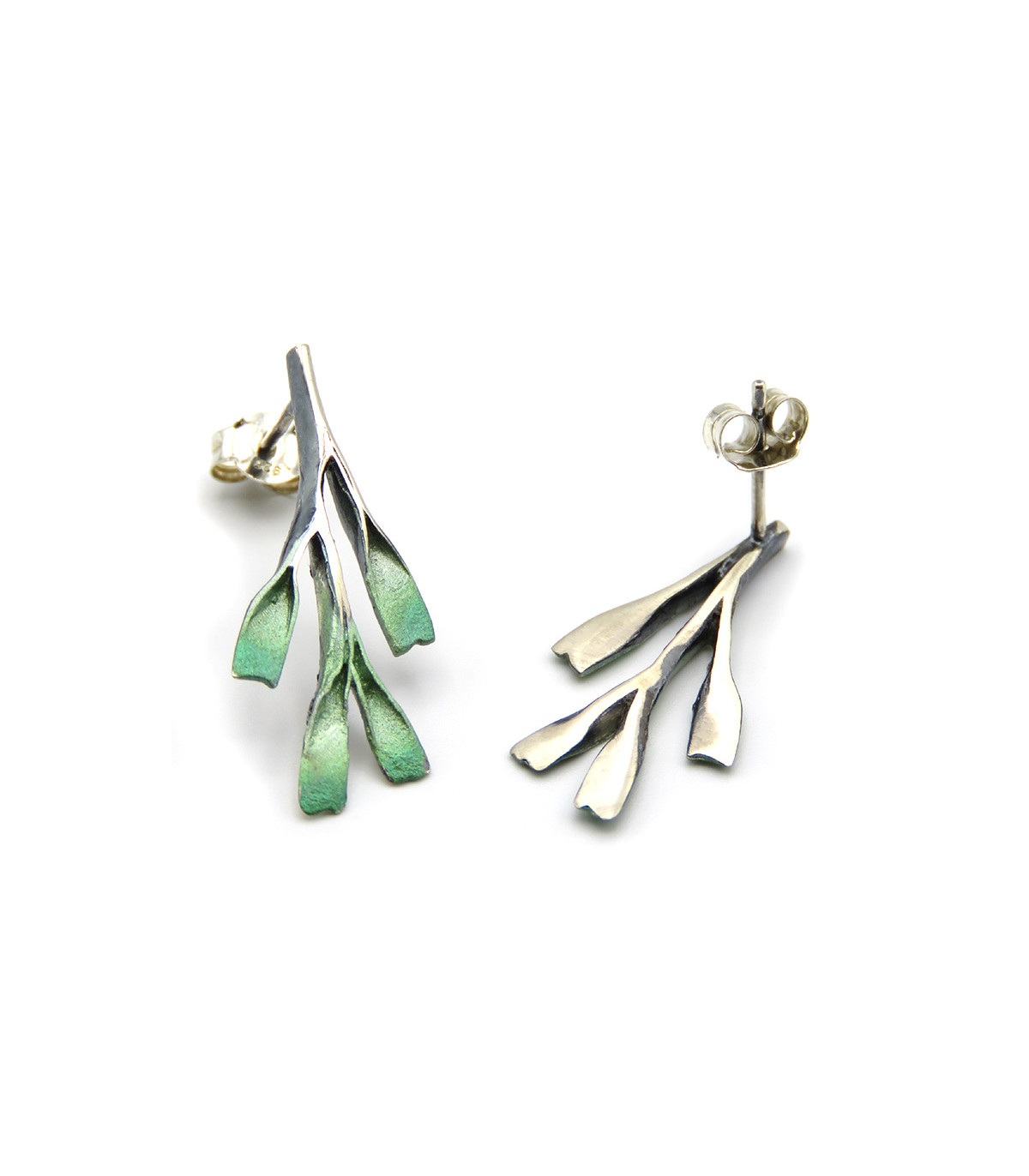 Los pendientes Copey de plata 925 son creados de forma artesanal por ORFEGA, joyería de autor de Santiago de Compostela, Galicia. Dicha colección está inspirada en las ramas de un árbol. Se trata de unos pendientes que evocan a la naturaleza y es perfecto para cualquier edad y estilo de persona. En esta ocasión ofrecemos el Copey en color verde con el centro de plata más brillante y toques de plata oxidada. Está realizado con la técnica SIMELTECH®. Se trata de unos pendientes alargados con forma orgánica de 30 mm de alto y 15 mm de ancho. Cierre de presión .