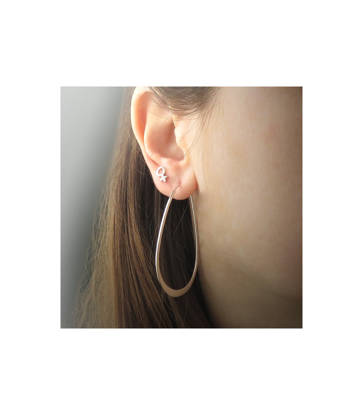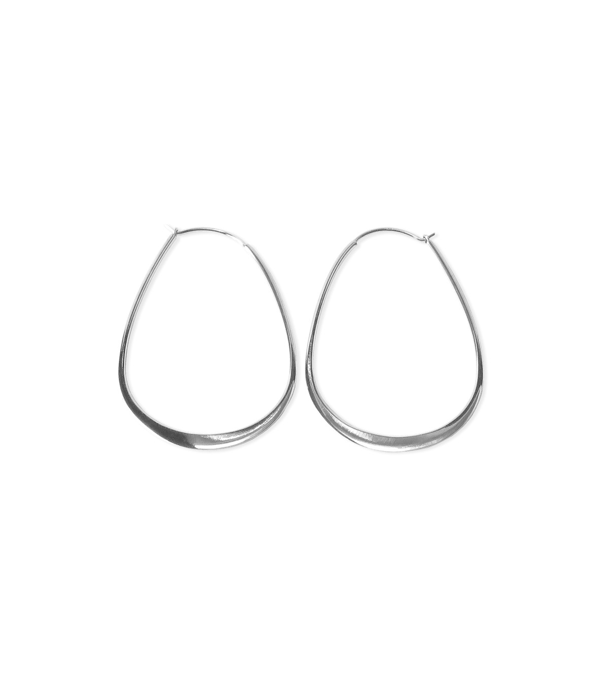 Estos pendientes son unos grandes aros ovalados de plata lisa. La medida de éstos es de 33 mm de ancho y 51 mm de altura. El grosor varía de 2 mm acabando en 4 mm de ancho lo que hace que sean unos pendientes muy resistentes. Además, estos aros se adaptan perfectamente al estilo de la persona que se los pone.