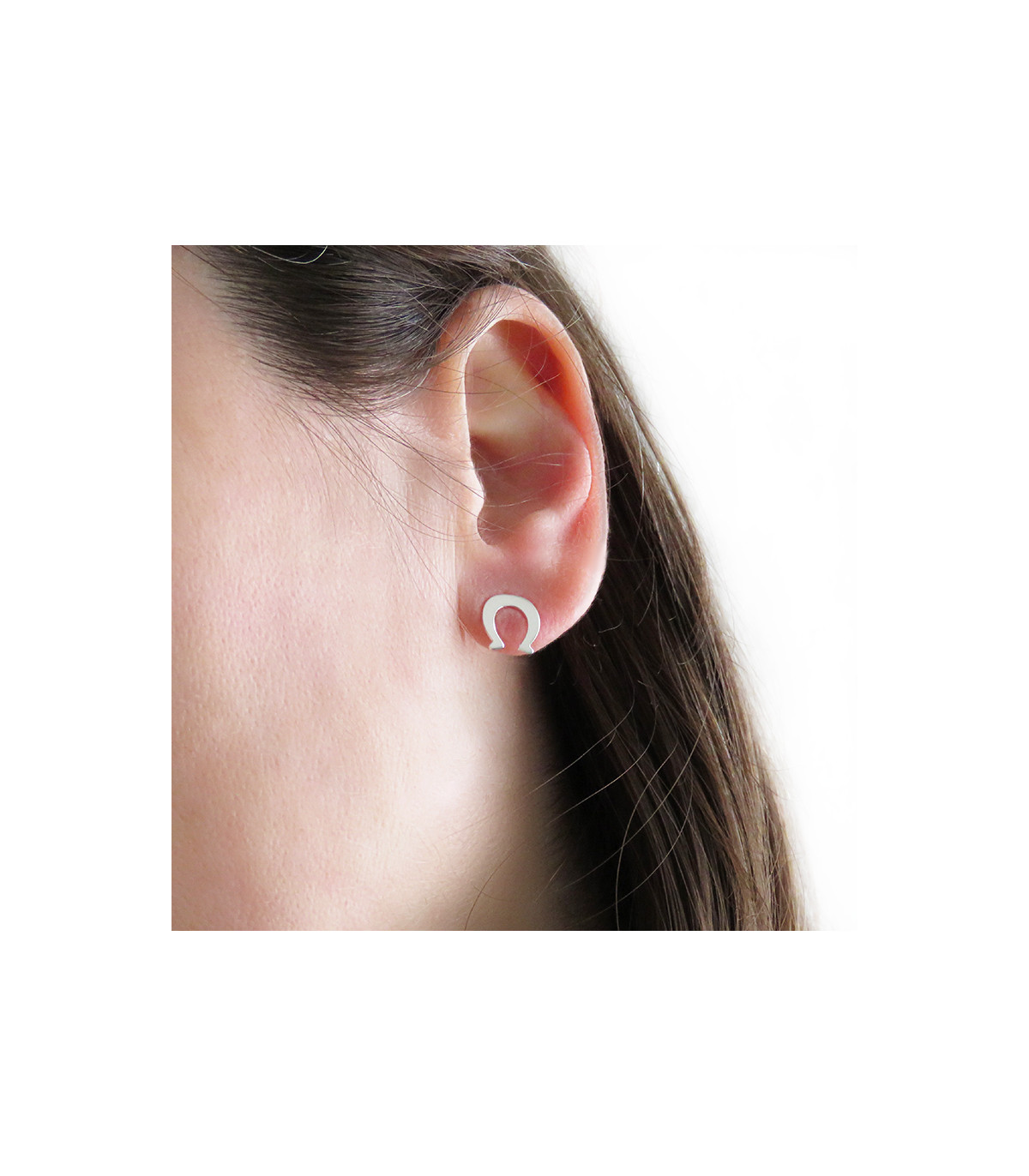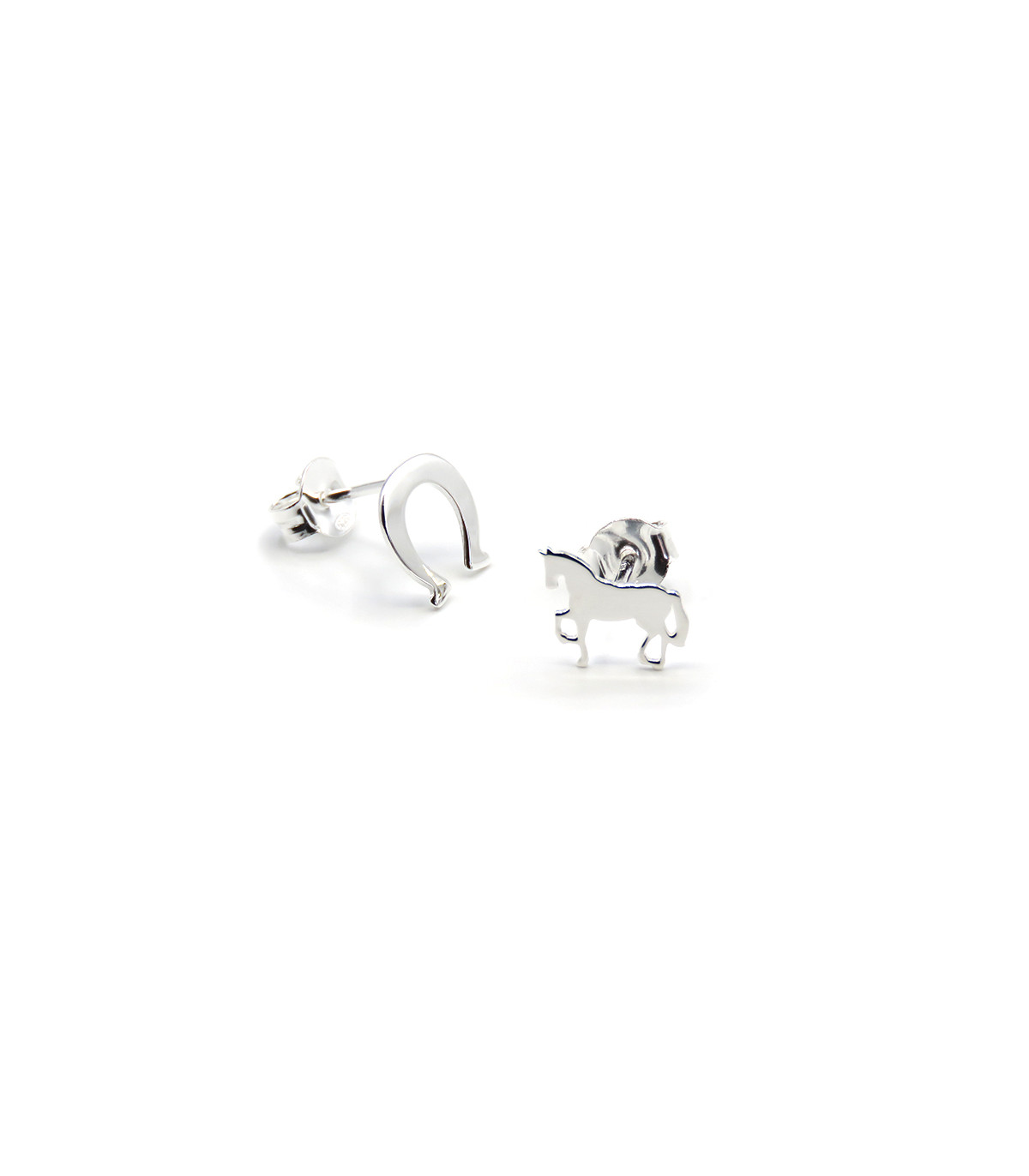 Esta pareja de pendientes son diferentes el uno del otro aunque de la misma temática ecuestre, se trata de un caballo por un lado y una herradura por otro. La medida es de 10 mm de ancho por 9 milímetros de alto. Están realizados en plata con acabado pulido espejo.
