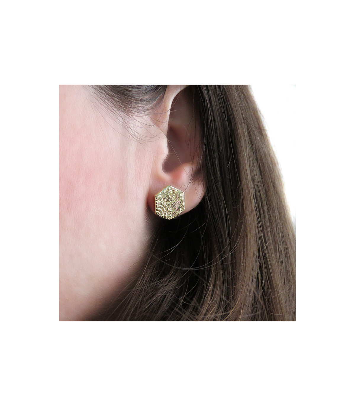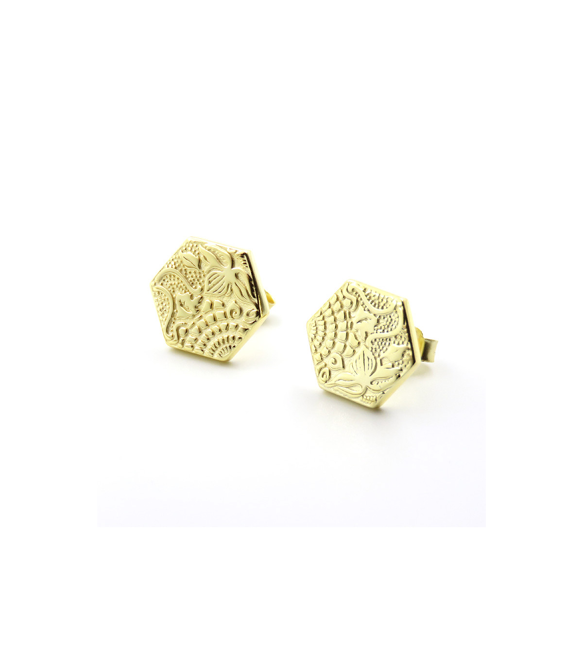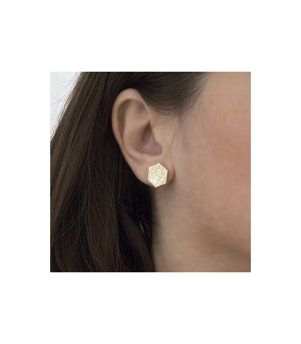 Los pendientes miden 15 mm de vértice a vértice y 6 mm cada lado del hexágono. Están realizados en plata de ley 925 con 1 micra de baño de oro de 18K pulida (relieve de las figuras) y con el fondo con acabado mate de manera que resaltan los detalles marinos con delicadeza.