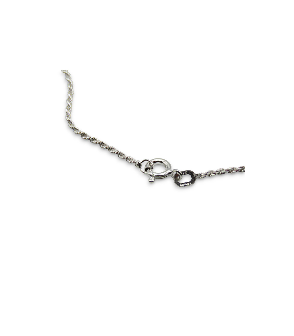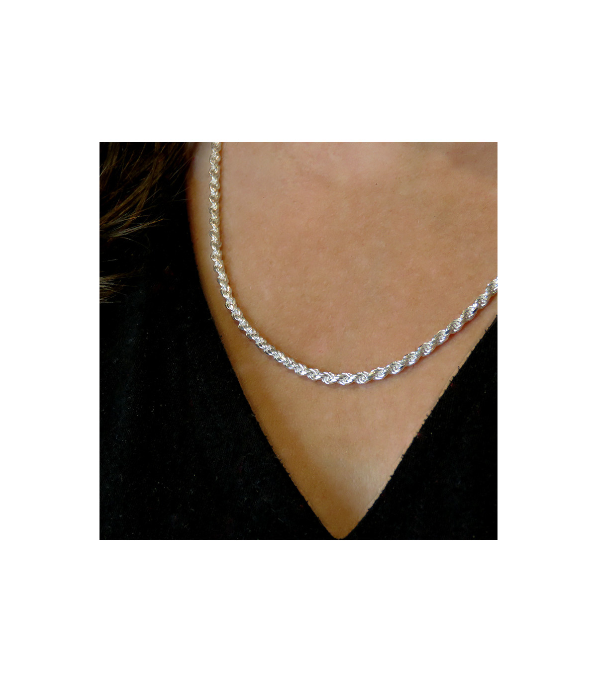 Collar de plata 925 hecho con una cadena trenzada del tipo cordón salomónico con acabado pulido ideal para todo tipo de persona de diferentes edades y estilos y es totalmente atemporal. Está disponible en diferentes longitudes y grosores. Tiene un cierre grueso y seguro de mosquetón adecuado al grosor de la cadena. Se puede llevar sola como collar o con un colgante