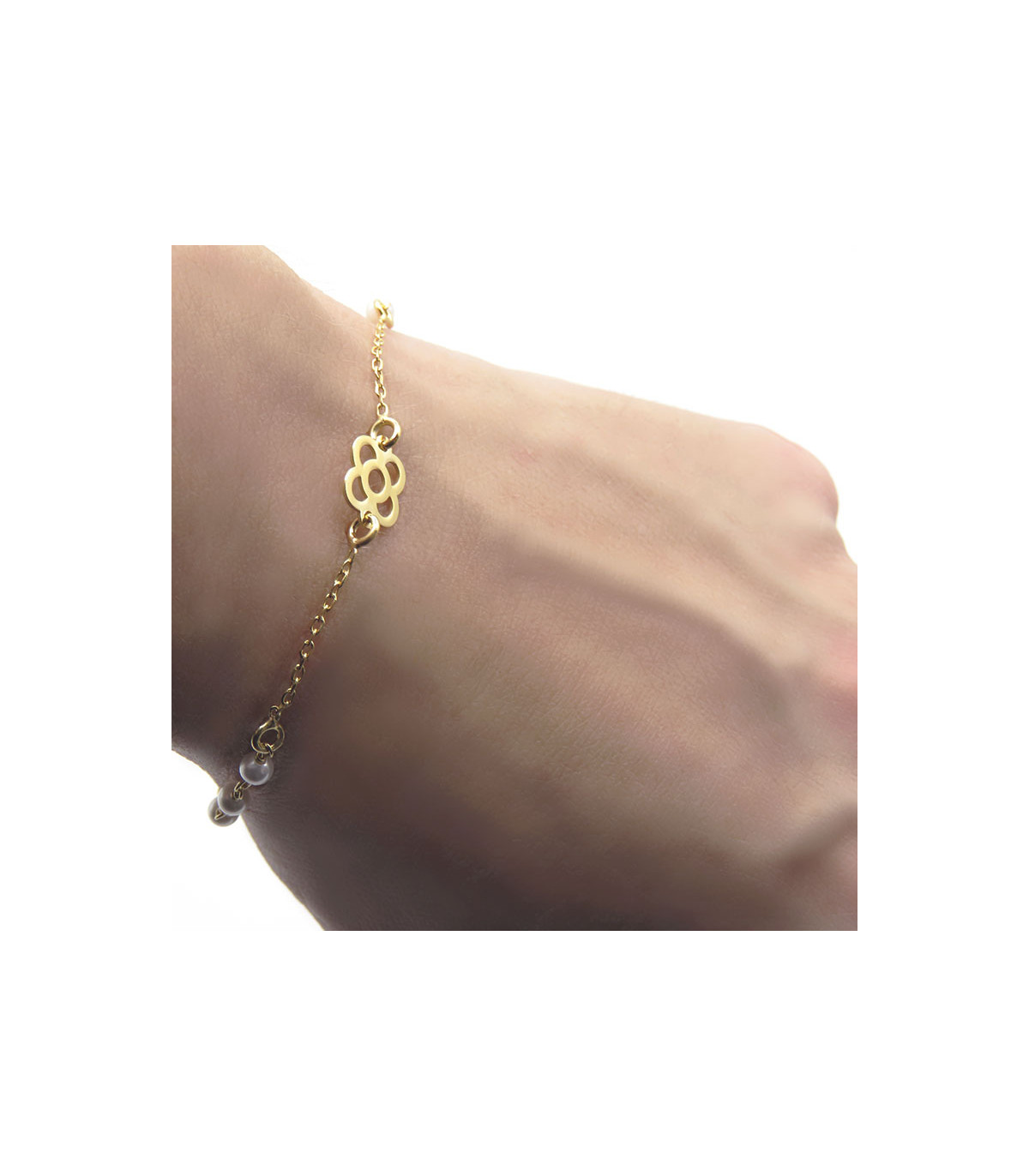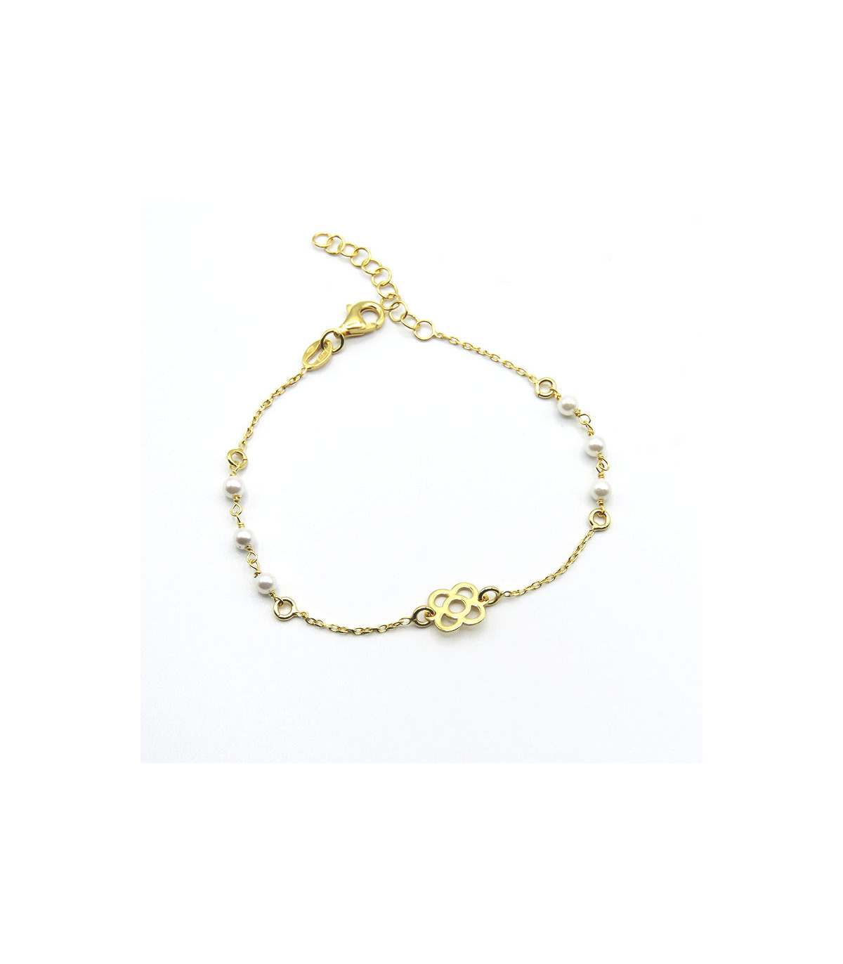 Esta pulsera tiene el detalle de seis perlas (tres en cada lado de la flor) y el cierre es de mosquetón.